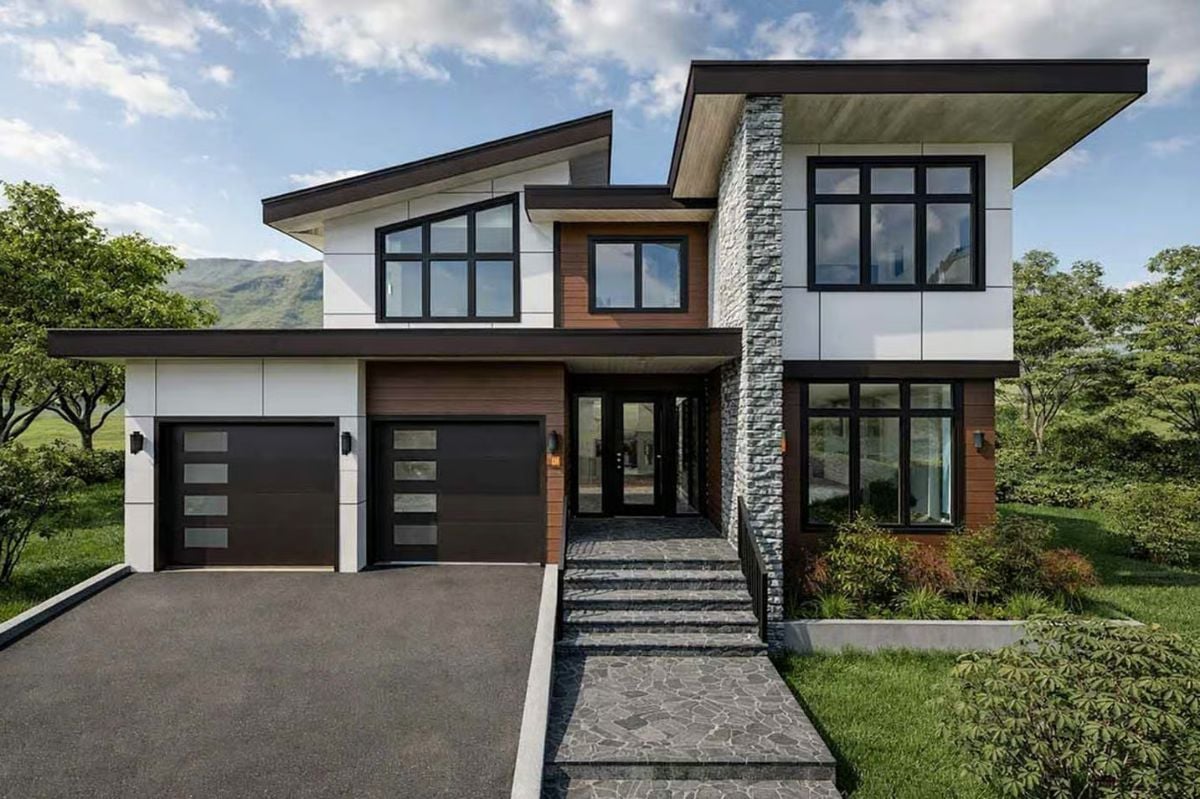 Why It Works: Elevating the main entry via an exterior staircase does more than address a sloped lot. It creates a natural separation between the garage level and living spaces, improving both privacy and noise control. Builders often use this approach on hillside sites to avoid costly excavation while still achieving a finished, intentional look.