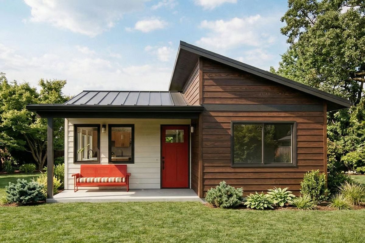 Horizontal wood siding in a rich cedar tone covers the main facade. A bold red entry door draws the eye. The covered porch holds two wood-framed chairs and a small round table. Metal roofing in charcoal ties the exterior together with clean, modern lines.