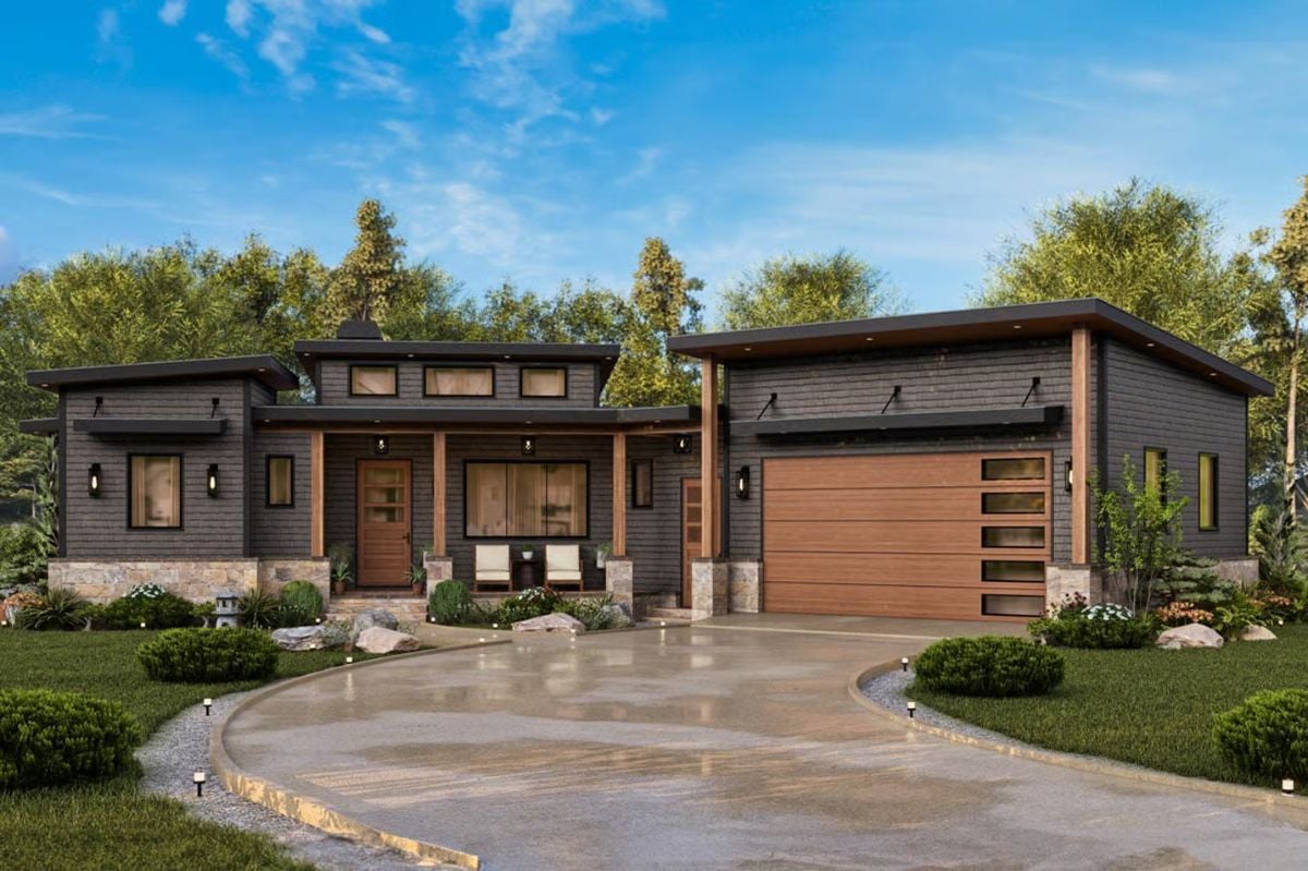 Exterior rendering shows a single-story modern home with dark siding, wood accents, and a circular driveway leading to an angled two-car garage. Below, the floor plan reveals three bedrooms, a central family room, covered front and rear porches, an open deck, mudroom, and kitchen with pantry access — all on one level.