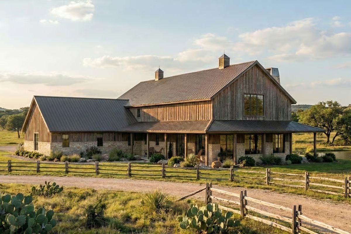This barndominium-style home blends rustic character with a modern layout designed for open living and everyday function. A large wraparound covered patio creates multiple outdoor access points and adds extra living space right off the main areas of the home.