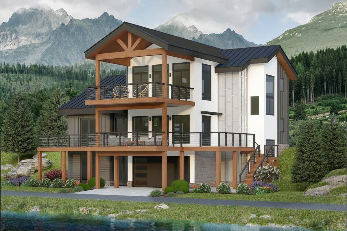This multi-level mountain home presents a strong, modern exterior with layered rooflines, extensive outdoor living spaces, and large windows designed to take advantage of views and natural light. The structure is vertically oriented, allowing each level to serve a clear purpose while maintaining a cohesive flow throughout the home. Covered decks and balconies wrap the exterior, extending living space across multiple floors without overwhelming the interior layout.