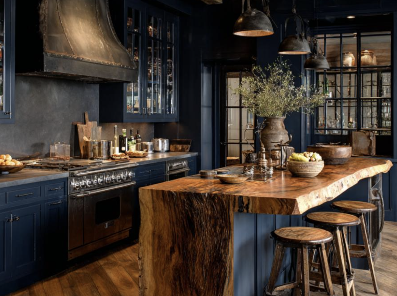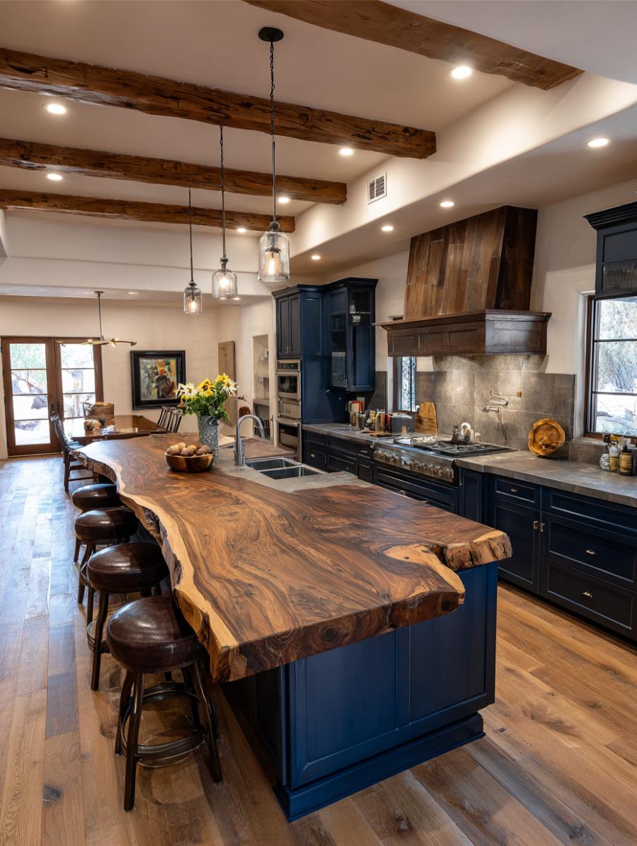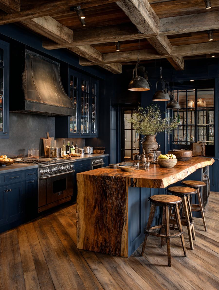 This breathtaking kitchen masterfully combines deep navy blue cabinetry with rich reclaimed wood elements, creating a sophisticated yet rustic atmosphere. The dramatic live-edge wooden island serves as a stunning centerpiece, perfectly complemented by the weathered ceiling beams and vintage-inspired pendant lighting. Industrial touches like the metal range hood and glass-front cabinets add modern functionality while maintaining the space’s cozy, farmhouse charm.