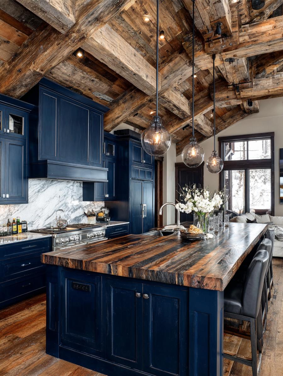 This stunning kitchen seamlessly blends rich navy blue cabinetry with dramatic reclaimed wood ceiling beams, creating a sophisticated yet cozy mountain retreat aesthetic. The butcher block island countertop adds warmth against the deep blue base, while sleek marble backsplash and stainless steel appliances provide modern luxury touches. Glass globe pendant lights and leather bar stools complete the look, striking the perfect balance between rustic charm and contemporary elegance.