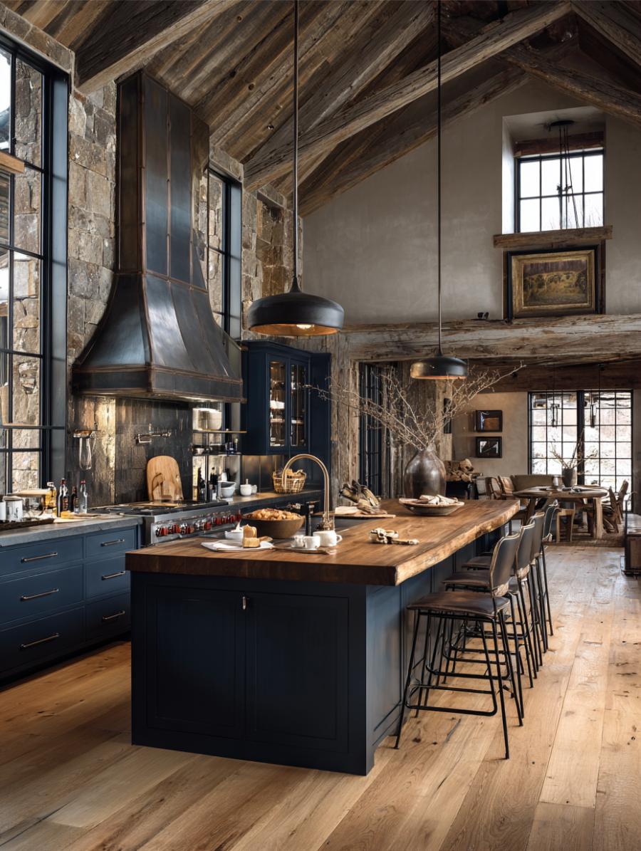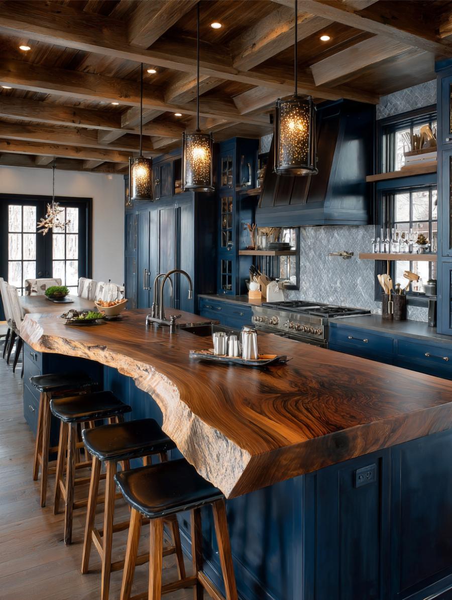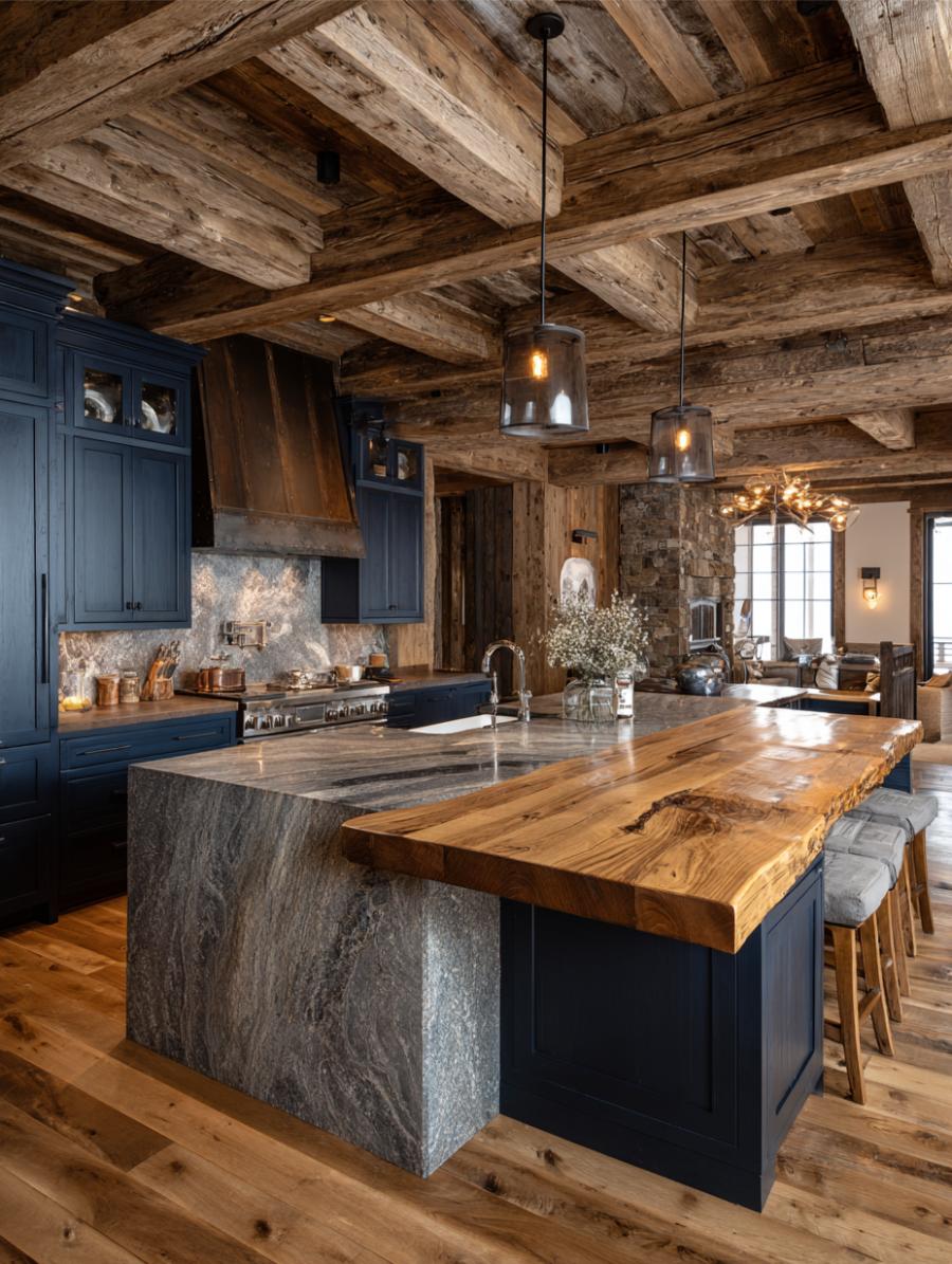 This stunning kitchen seamlessly blends rich navy blue cabinetry with rustic reclaimed wood ceiling beams and a dramatic live-edge wood countertop that serves as both functional workspace and artistic centerpiece. The sophisticated color palette is anchored by a striking stone waterfall island base and complemented by warm brass fixtures, while smoky glass pendant lights add an industrial touch to the mountain lodge aesthetic. Natural textures and materials create a perfect balance between refined elegance and cozy cabin charm.