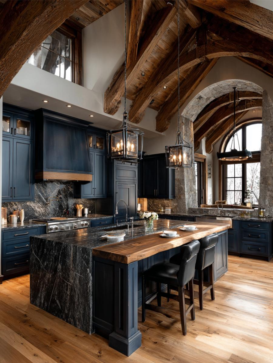 This stunning kitchen masterfully blends rustic charm with contemporary luxury, featuring rich navy blue cabinetry that creates a striking contrast against the warm honey-toned wooden beams and hardwood floors. The dramatic black marble waterfall island serves as the room’s centerpiece, topped with a thick walnut butcher block countertop and illuminated by oversized glass pendant lights that cast a warm glow throughout the space. The stone archway and exposed timber ceiling add architectural interest while maintaining the kitchen’s sophisticated yet cozy mountain lodge aesthetic.