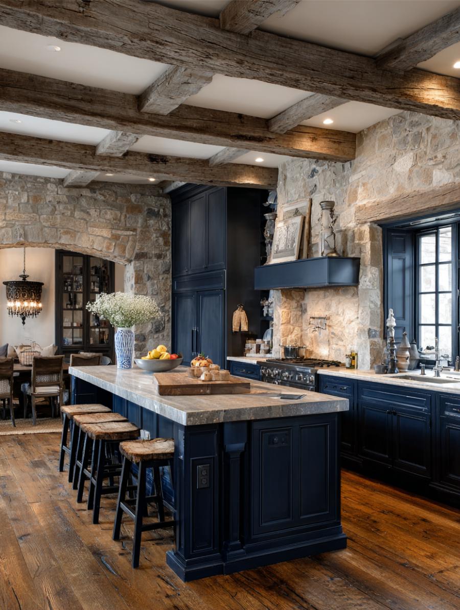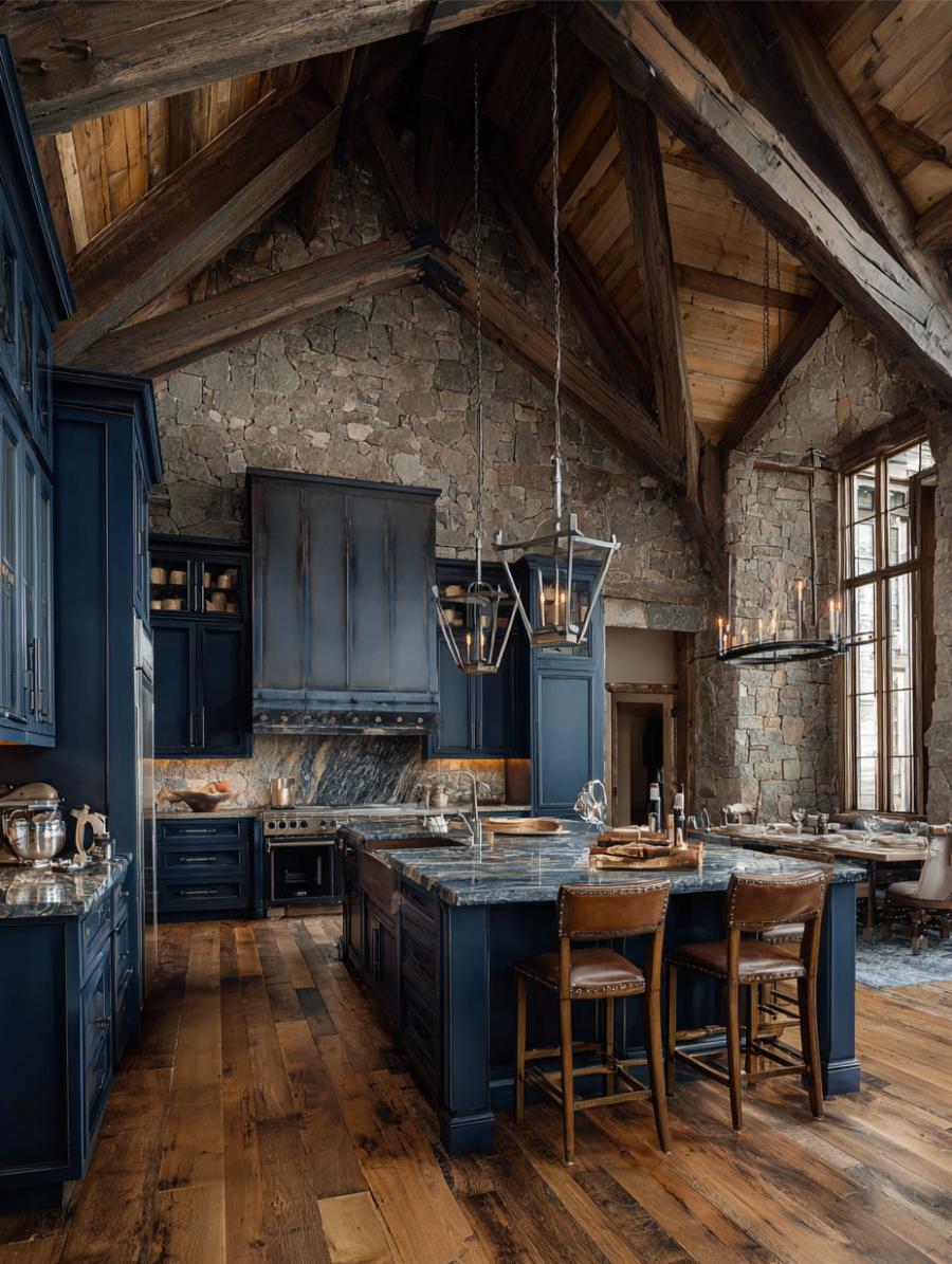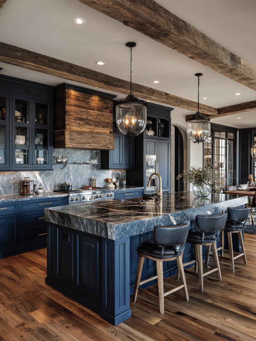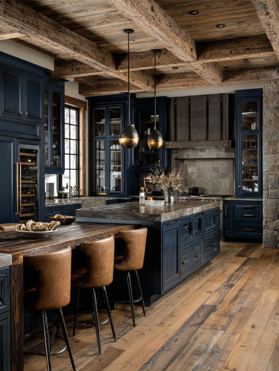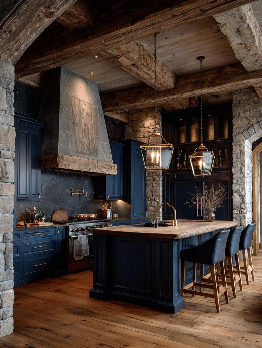 This stunning kitchen masterfully combines rich navy blue cabinetry with exposed reclaimed wood beams and rustic stone accents, creating a sophisticated yet cozy atmosphere. The dark countertops and brass lantern-style pendant lights add warmth against the moody blue palette, while the weathered hardwood floors and stone backsplash bring authentic rustic charm. Glass-front upper cabinets showcase beautiful dishware, perfectly balancing the kitchen’s dramatic color scheme with functional elegance.