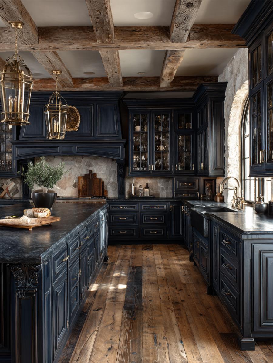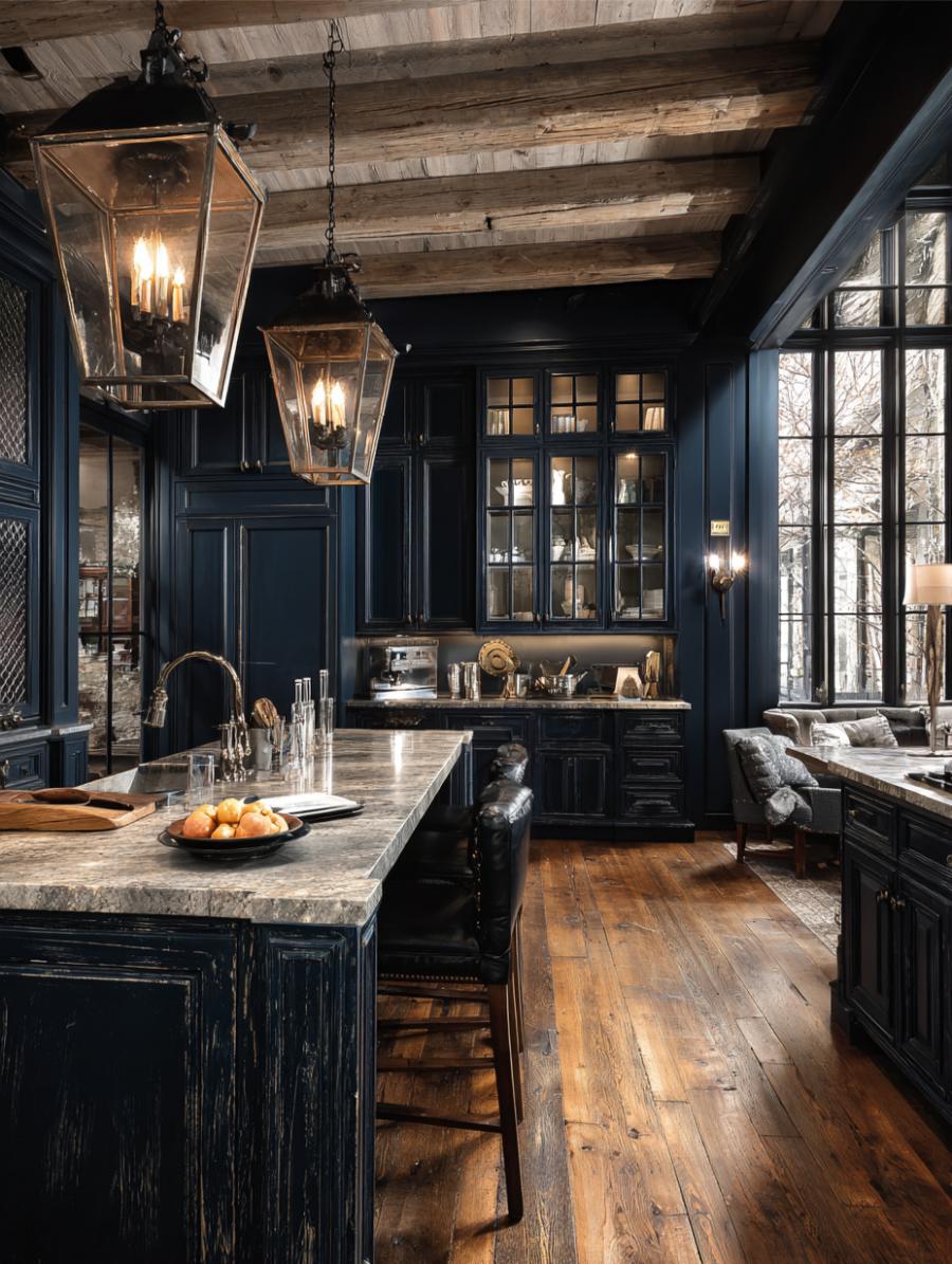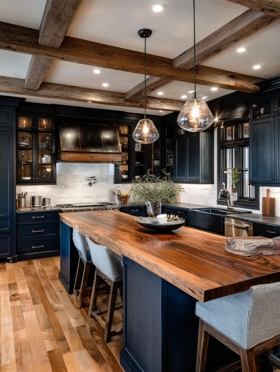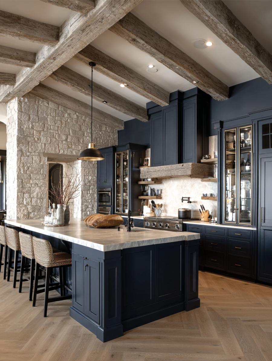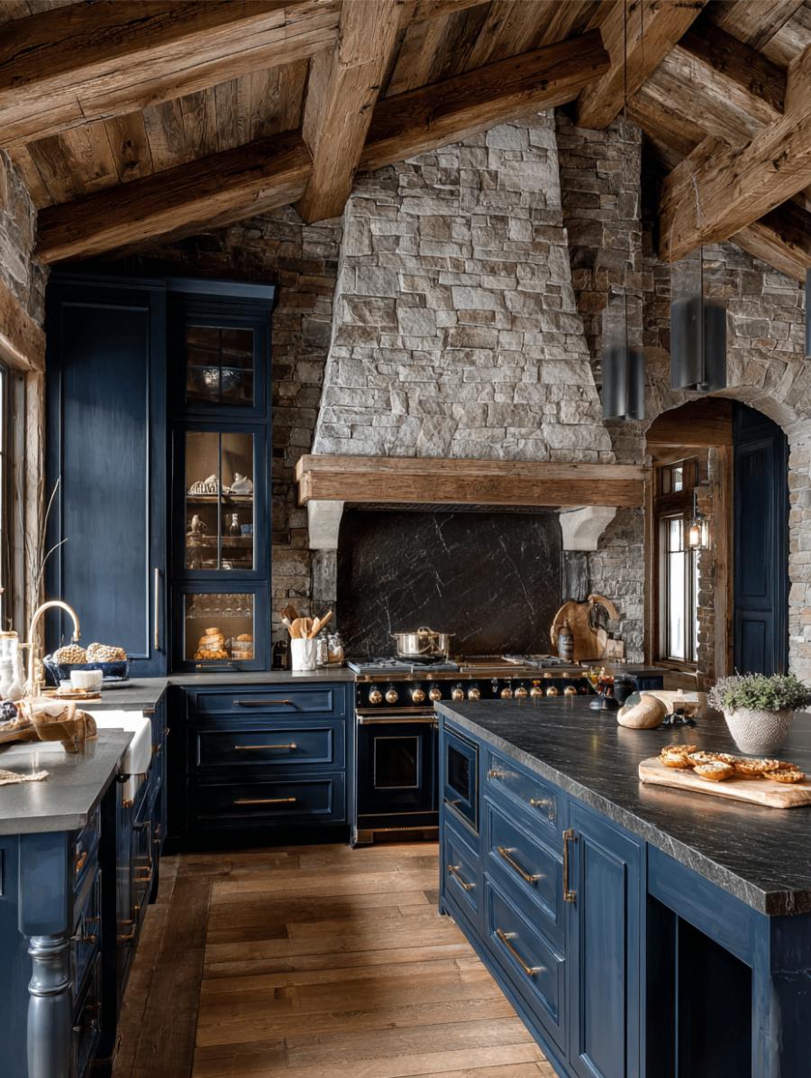 This stunning kitchen masterfully combines rich navy blue cabinetry with exposed reclaimed wood beams and rustic stone accents, creating a sophisticated yet cozy atmosphere. The dark countertops and brass lantern-style pendant lights add warmth against the moody blue palette, while the weathered hardwood floors and stone backsplash bring authentic rustic charm. Glass-front upper cabinets showcase beautiful dishware, perfectly balancing the kitchen’s dramatic color scheme with functional elegance.