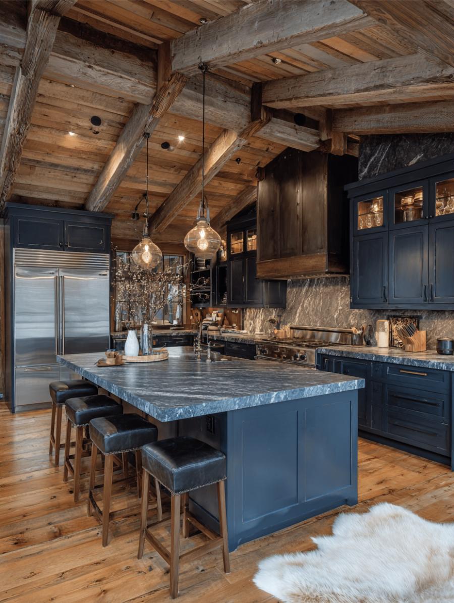 This stunning kitchen masterfully blends deep navy blue cabinetry with rich reclaimed wood ceiling beams and warm hardwood floors, creating a perfect balance of rustic charm and refined elegance. The dramatic gray marble countertops and backsplash add luxurious texture, while amber glass pendant lights and black leather bar stools provide sophisticated finishing touches. A cozy white sheepskin rug softens the space, completing this mountain lodge-inspired design that feels both grand and inviting.