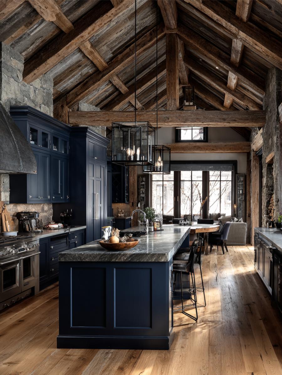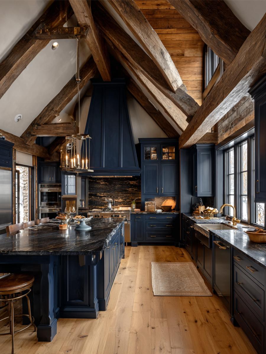 This stunning kitchen masterfully blends rich navy blue cabinetry with dramatic exposed wooden ceiling beams and natural stone accents, creating a perfect marriage of rustic charm and refined elegance. The deep blue island and perimeter cabinets are beautifully contrasted by dark granite countertops and warm honey-toned hardwood flooring, while industrial-style pendant lights add a contemporary edge. The soaring vaulted ceiling with its weathered wood beams draws the eye upward, emphasizing the grand scale and creating an inviting yet sophisticated atmosphere that feels both cozy and luxurious.