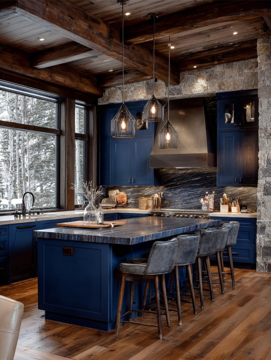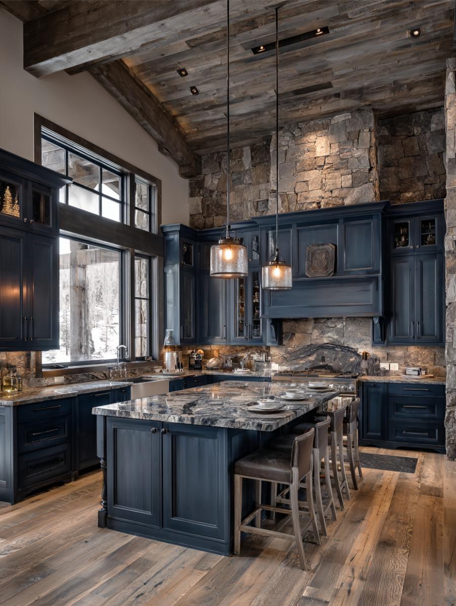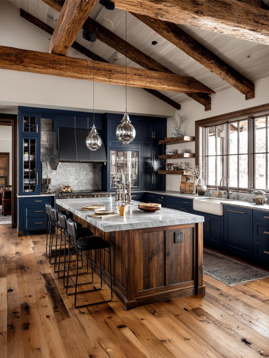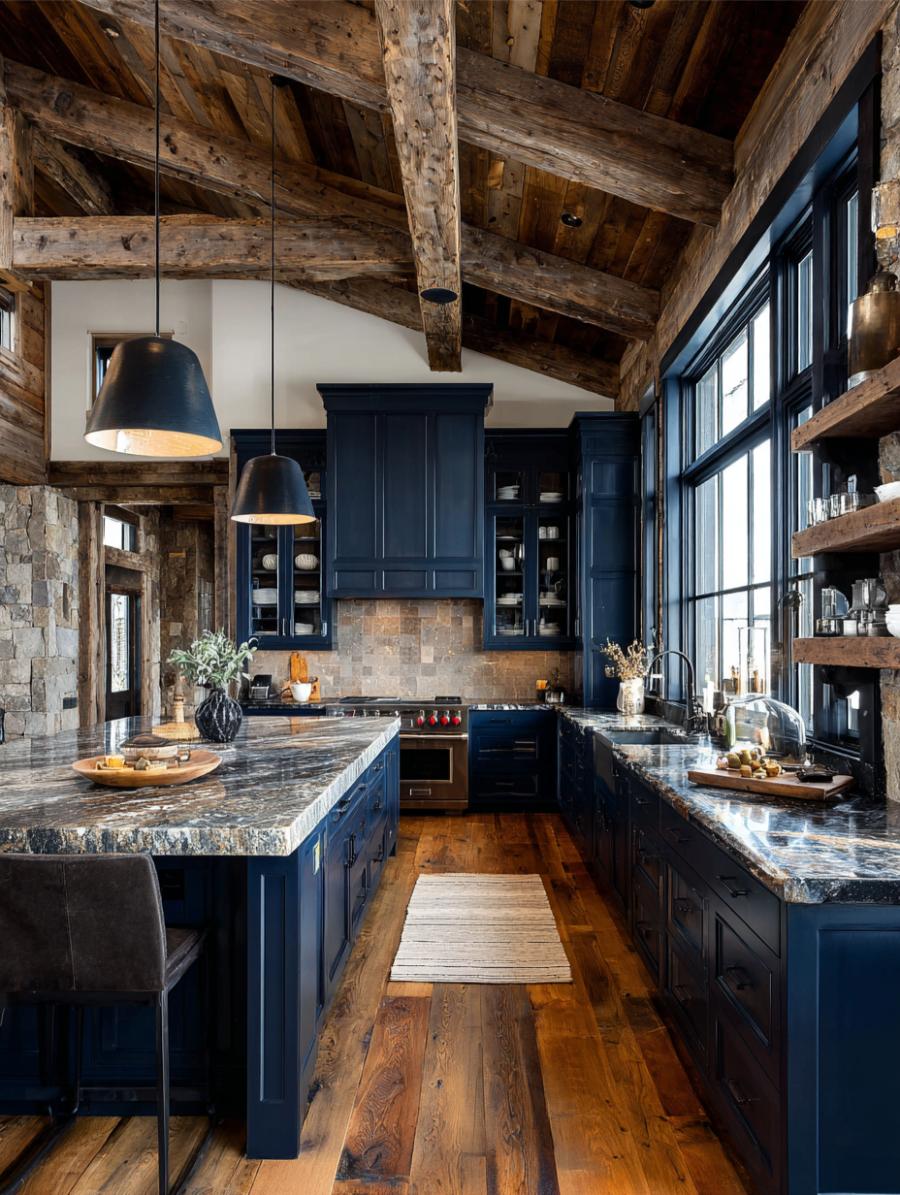 This stunning rustic kitchen masterfully combines deep navy blue cabinetry with dramatic exposed wooden ceiling beams and natural stone elements, creating a sophisticated mountain lodge aesthetic. The rich blue cabinets are beautifully complemented by veined marble countertops and a neutral stone tile backsplash, while warm hardwood floors and pendant lighting add inviting warmth. Large black-framed windows flood the space with natural light, perfectly balancing the bold navy palette with organic textures and materials.