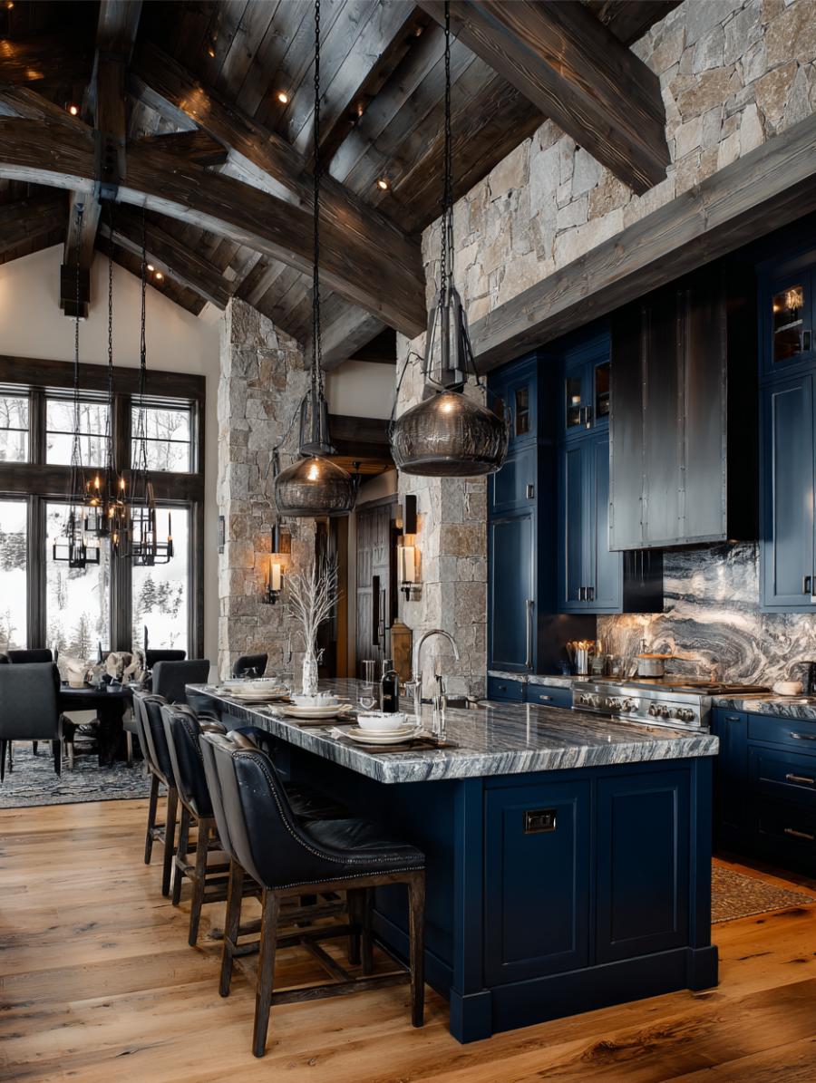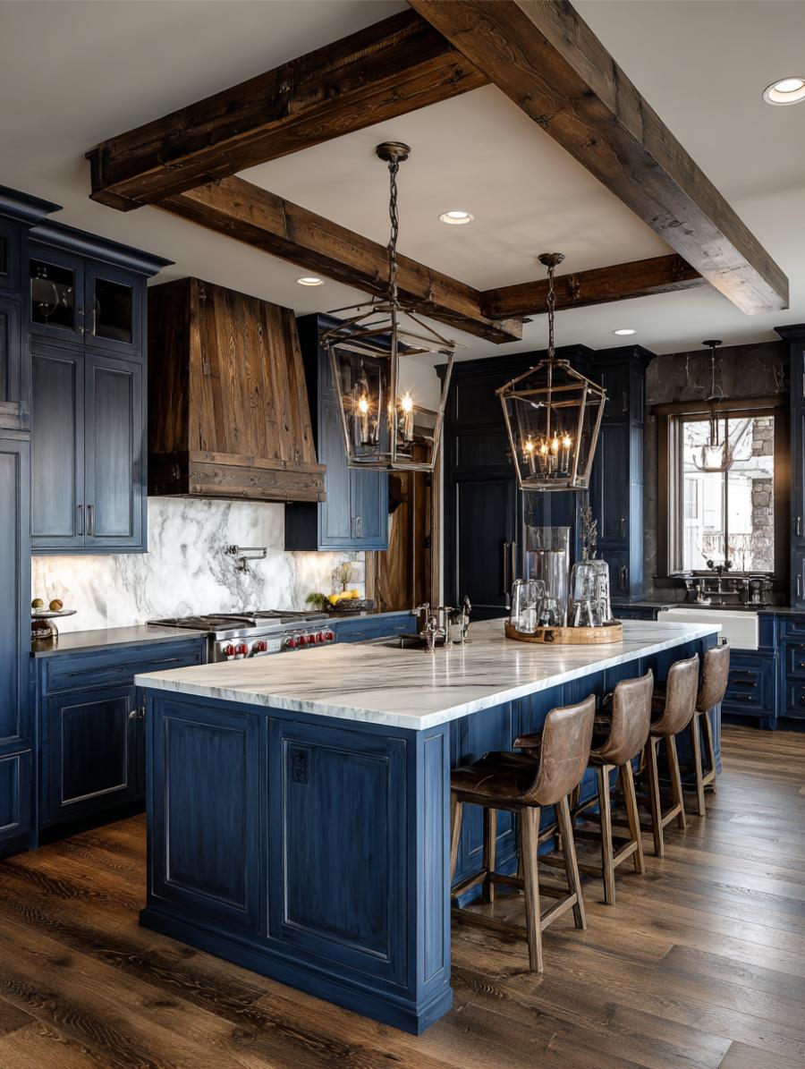 This stunning kitchen seamlessly blends rich navy blue cabinetry with warm natural materials, creating a sophisticated rustic retreat. Dramatic veined marble countertops and backsplash contrast beautifully against the deep blue cabinets, while exposed wooden ceiling beams and stone accent walls add authentic mountain lodge charm. Wire cage pendant lights and charcoal leather bar stools complete the look, striking the perfect balance between cozy cabin comfort and refined modern luxury.