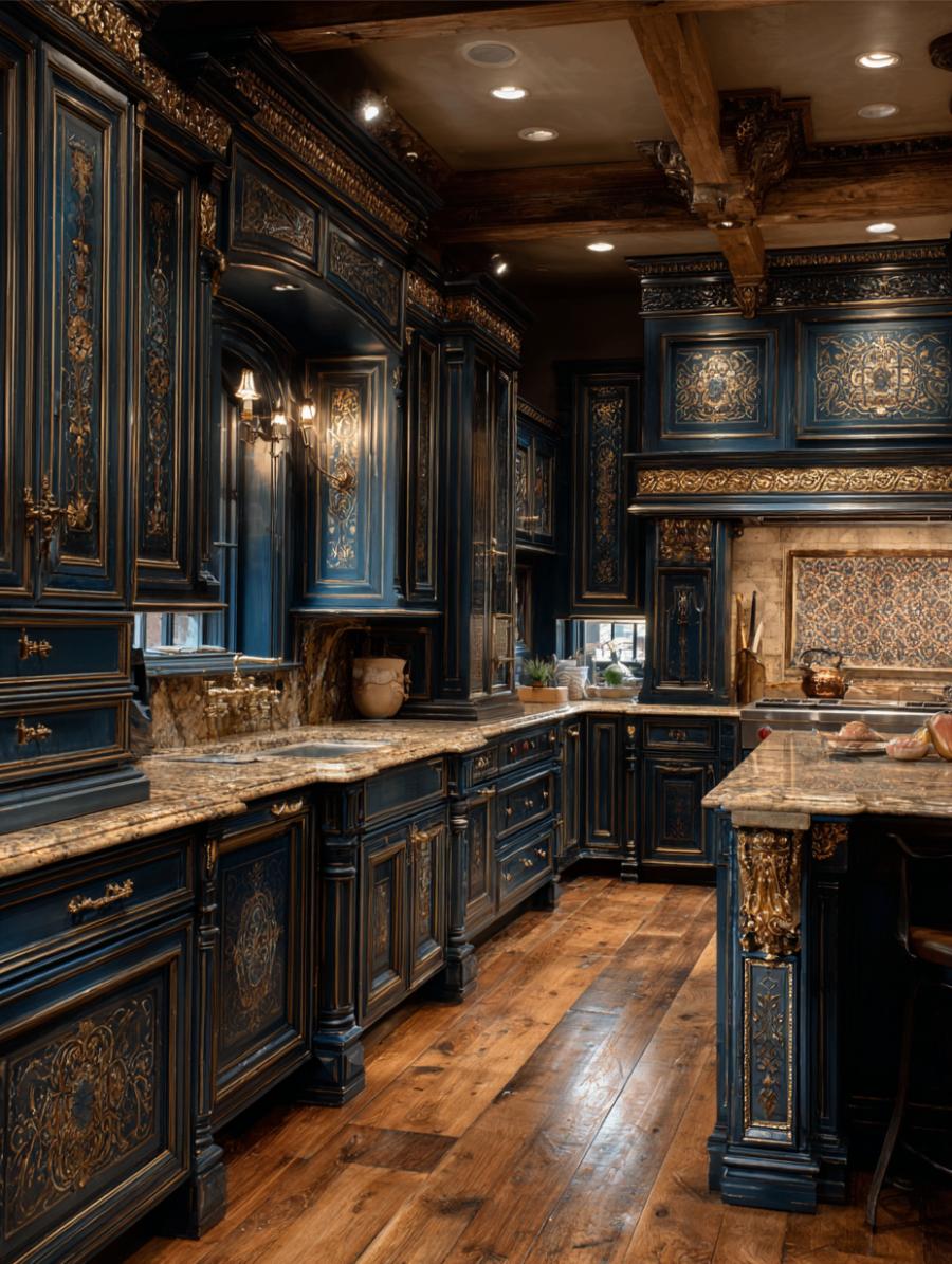 This breathtaking kitchen showcases deep navy cabinetry adorned with intricate golden baroque details and ornate carved moldings that evoke the grandeur of a European palace. Rich marble countertops with dramatic veining complement the luxurious gold accents, while warm hardwood floors and exposed ceiling beams add rustic charm to balance the formal elegance. The space masterfully blends old-world craftsmanship with modern functionality, creating a culinary sanctuary fit for royalty.