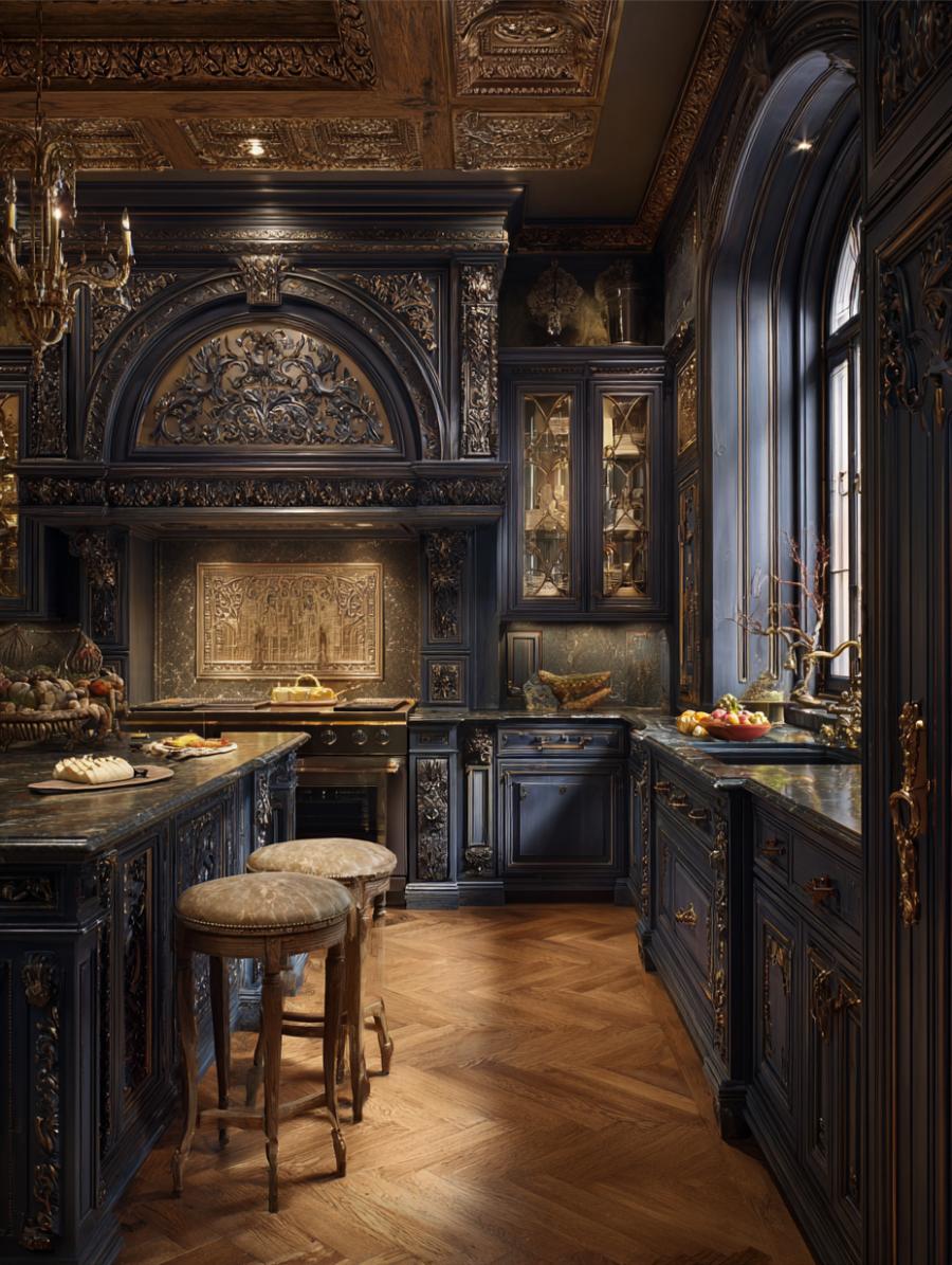 This breathtaking navy blue kitchen transforms the heart of the home into a palatial masterpiece, featuring deeply carved cabinetry in rich midnight tones that contrast beautifully with golden ornate detailing and an elaborate coffered ceiling. The space exudes old-world European elegance with its arched range hood adorned with intricate scrollwork, glass-front display cabinets, and luxurious materials including dark granite countertops and warm herringbone wood flooring. Soft natural light filters through tall arched windows, illuminating the opulent brass fixtures and creating a sophisticated ambiance that feels both grand and surprisingly intimate.
