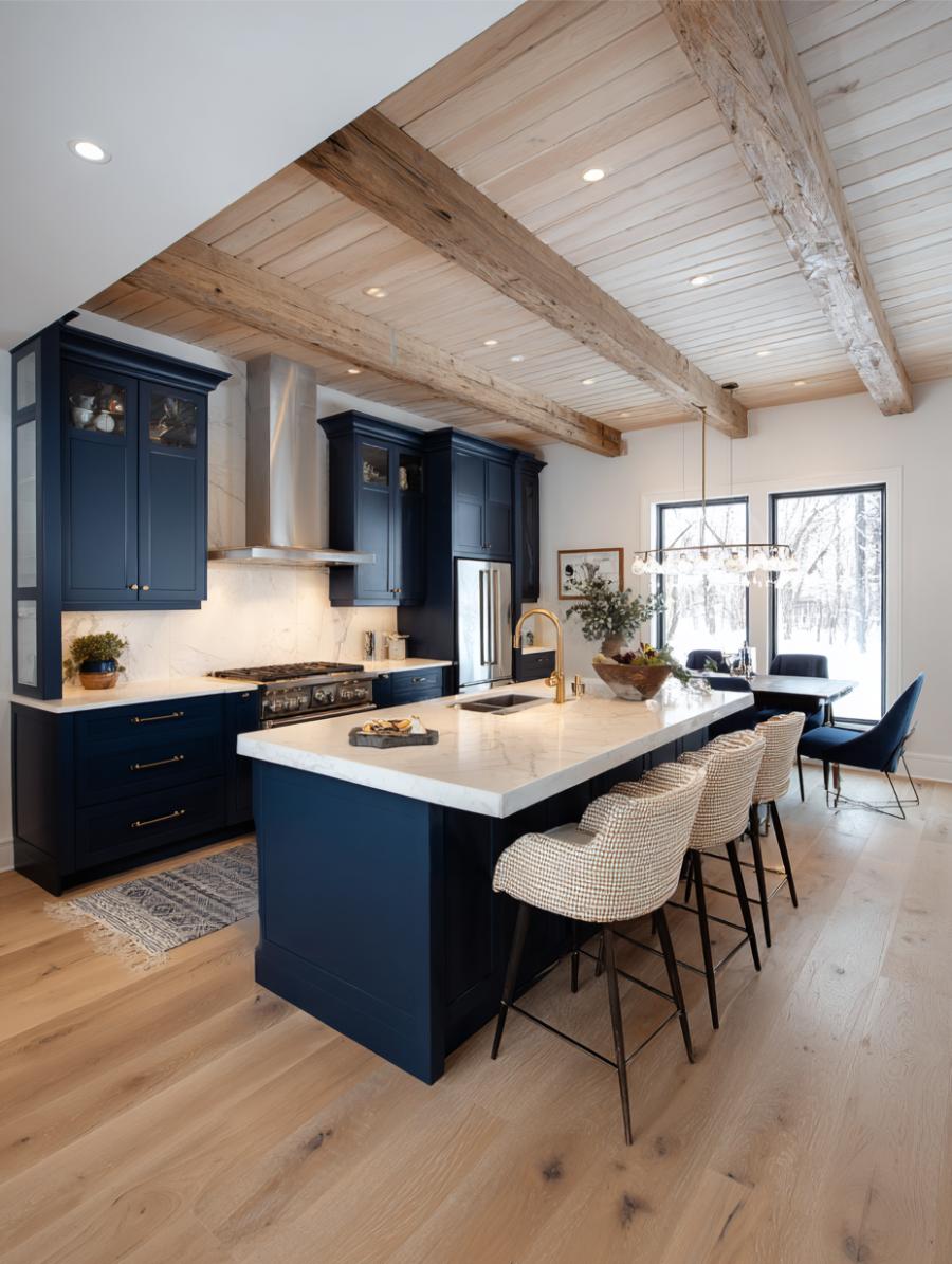 This stunning kitchen seamlessly blends rustic charm with modern sophistication, featuring rich navy blue cabinetry paired with warm natural wood ceiling beams and light oak flooring. The spacious island anchors the space with a pristine white quartz countertop, complemented by woven neutral bar stools and brass hardware that adds a touch of luxury. Recessed lighting and a statement chandelier illuminate the space, while large windows flood the room with natural light, creating a perfect balance between cozy farmhouse appeal and contemporary refinement.