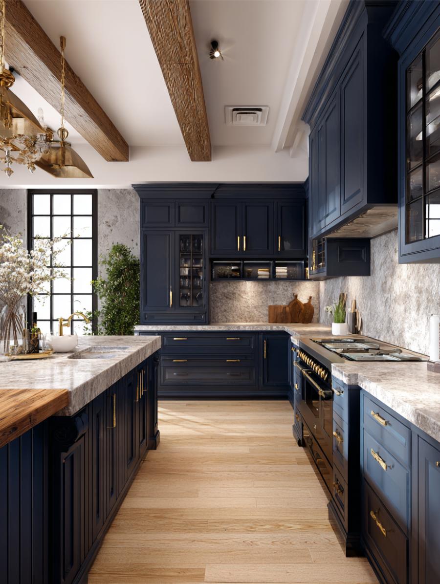 This stunning kitchen masterfully combines rich navy blue cabinetry with warm brass hardware and natural stone countertops, creating a perfect balance of contemporary luxury and rustic charm. The exposed wooden ceiling beams and light oak flooring add organic warmth that beautifully contrasts with the dramatic deep blue cabinetry and marble backsplash. The spacious layout features both an island and extensive counter space, all tied together with sophisticated brass accents that elevate this kitchen from simply functional to absolutely breathtaking.