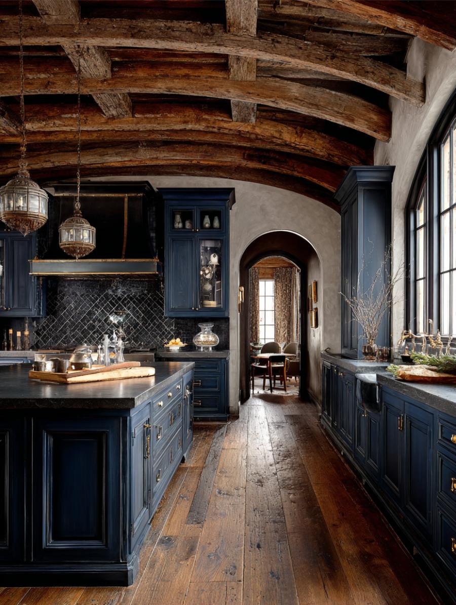 This stunning kitchen seamlessly blends old-world charm with sophisticated navy blue cabinetry, featuring rich wooden ceiling beams that create dramatic archways overhead. The deep navy cabinets are perfectly complemented by dark granite countertops, a striking black diamond-pattern backsplash, and warm brass hardware that adds luxurious touches throughout. Vintage pendant lanterns and wide-plank hardwood floors complete this European-inspired design that feels both timeless and elegantly moody.