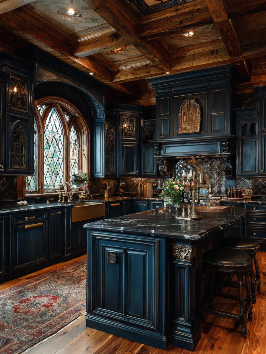 This opulent navy blue kitchen channels Old World elegance with its coffered wooden ceiling, ornate carved details, and deep sapphire cabinetry that creates a dramatic backdrop against rich copper accents. The Gothic arched window with diamond-paned glass floods the space with natural light, while the dark marble island and leather bar stools add layers of luxury to this sophisticated culinary sanctuary. An ornate Persian rug grounds the polished hardwood floors, completing this regal kitchen that perfectly balances medieval grandeur with modern functionality.