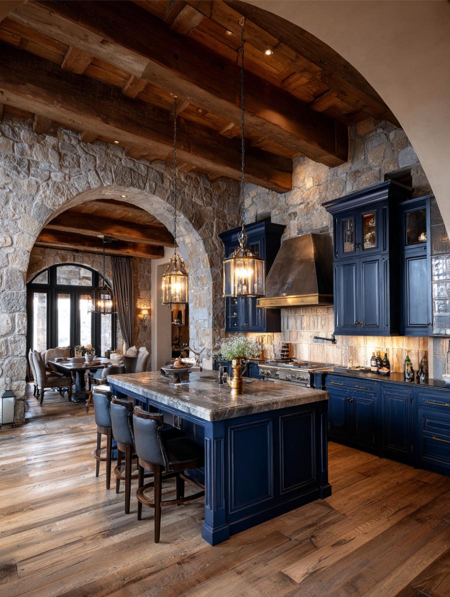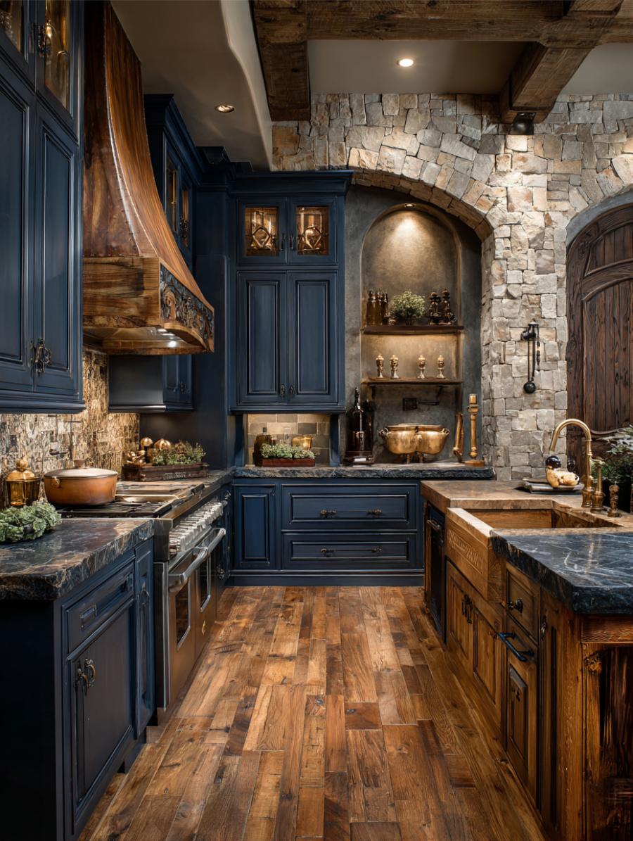 This stunning kitchen masterfully combines deep navy blue cabinetry with warm natural stone walls and rich hardwood flooring to create a space that feels both sophisticated and inviting. The arched stone alcove with built-in shelving adds architectural drama, while copper cookware and brass fixtures provide warm metallic accents against the moody blue palette. Exposed wooden ceiling beams and dark granite countertops complete the rustic-luxe aesthetic, creating a kitchen that feels like a cozy yet refined European manor.