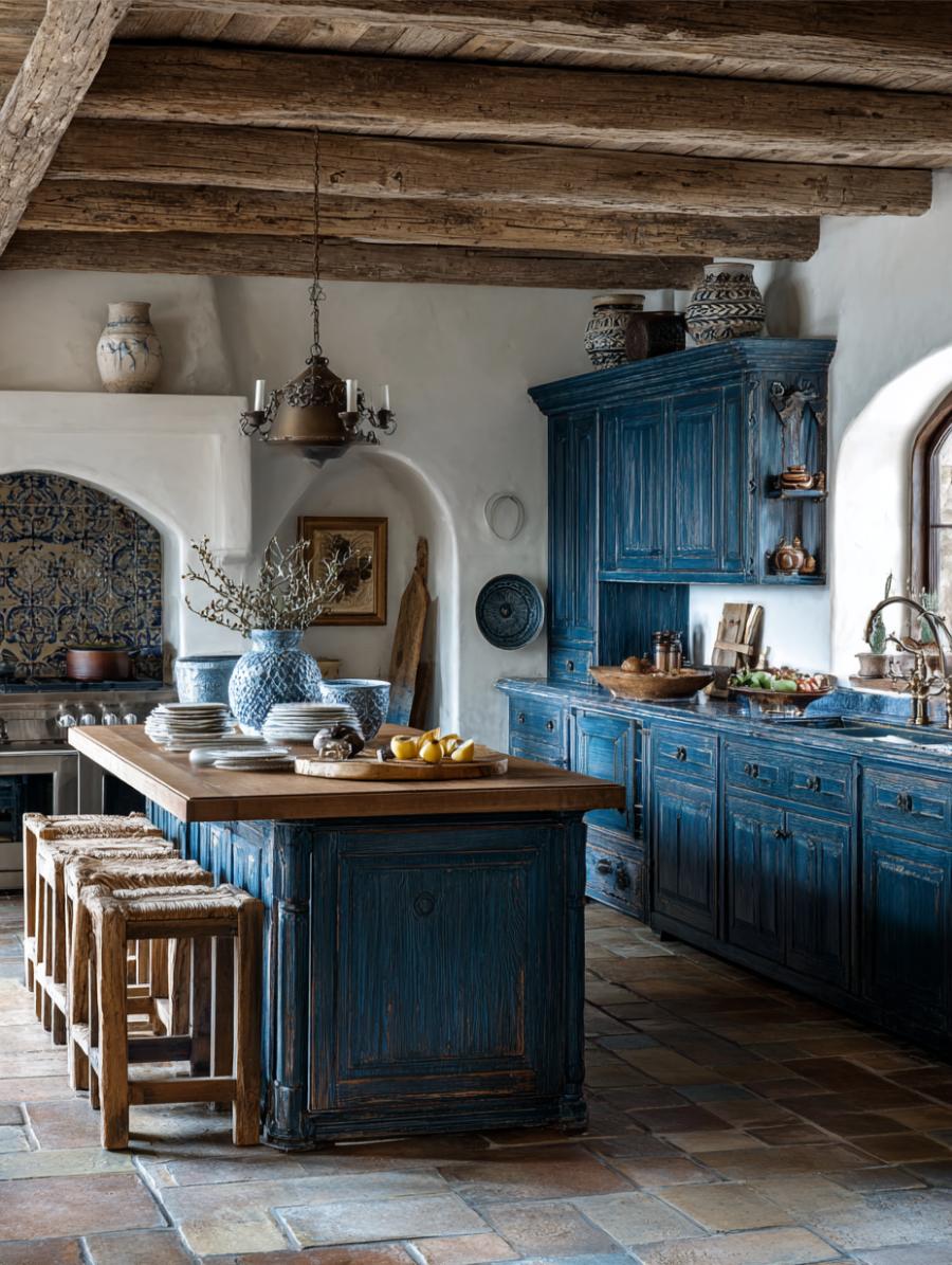 This stunning kitchen showcases distressed navy blue cabinetry that perfectly complements the rustic exposed wood beams and terracotta tile flooring. The weathered finish on the blue cabinets, paired with woven rush bar stools and decorative pottery displayed on open shelving, creates an authentic Mediterranean farmhouse aesthetic. The arched alcove with intricate blue and white tilework behind the range adds an extra layer of Old-World sophistication to this timeless design.