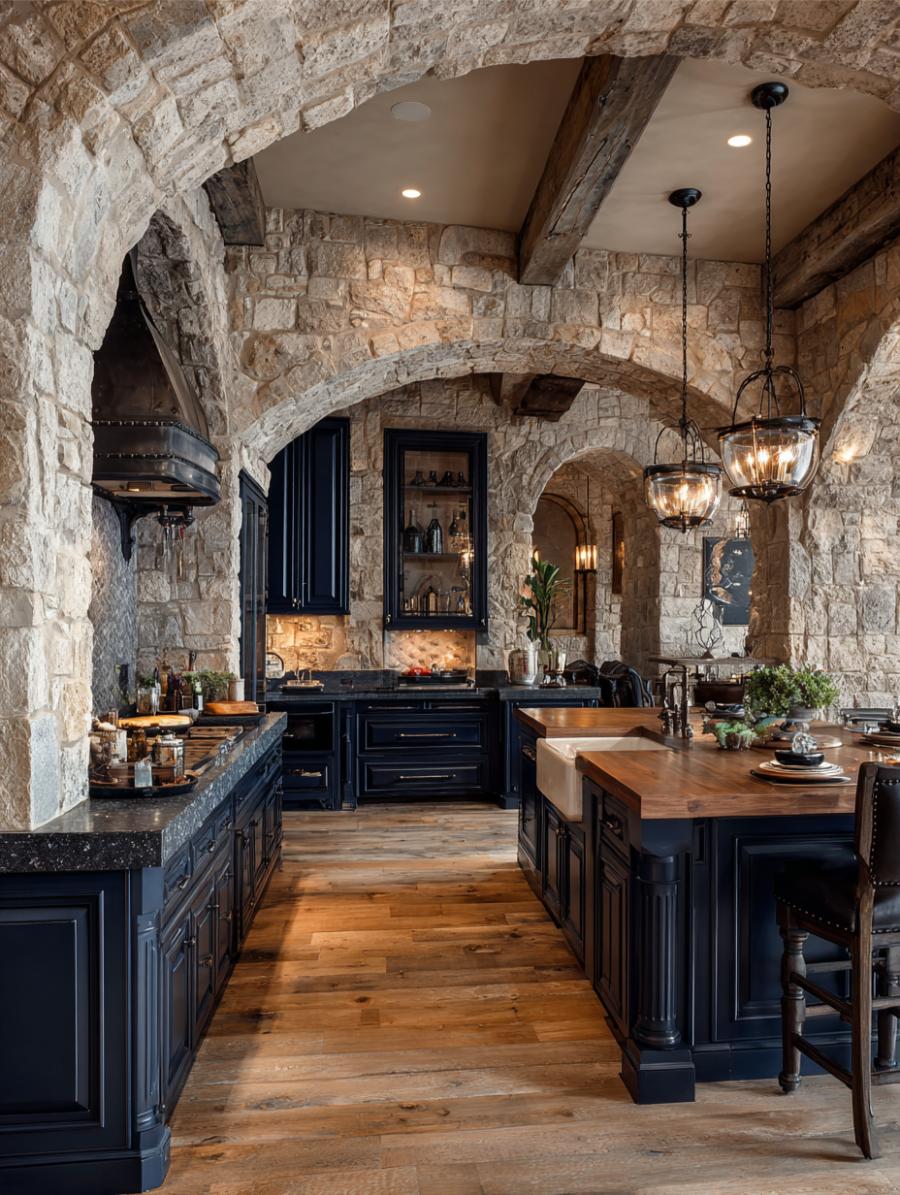 This breathtaking kitchen seamlessly blends old-world charm with contemporary sophistication, featuring deep navy blue cabinetry that creates a striking contrast against the rustic stone archways and walls. Warm wood countertops and exposed ceiling beams add organic texture, while elegant glass pendant lights illuminate the space with a soft, romantic glow. The combination of rich hardwood floors, copper sink, and carefully curated accessories creates an atmosphere that feels both timelessly elegant and refreshingly modern.