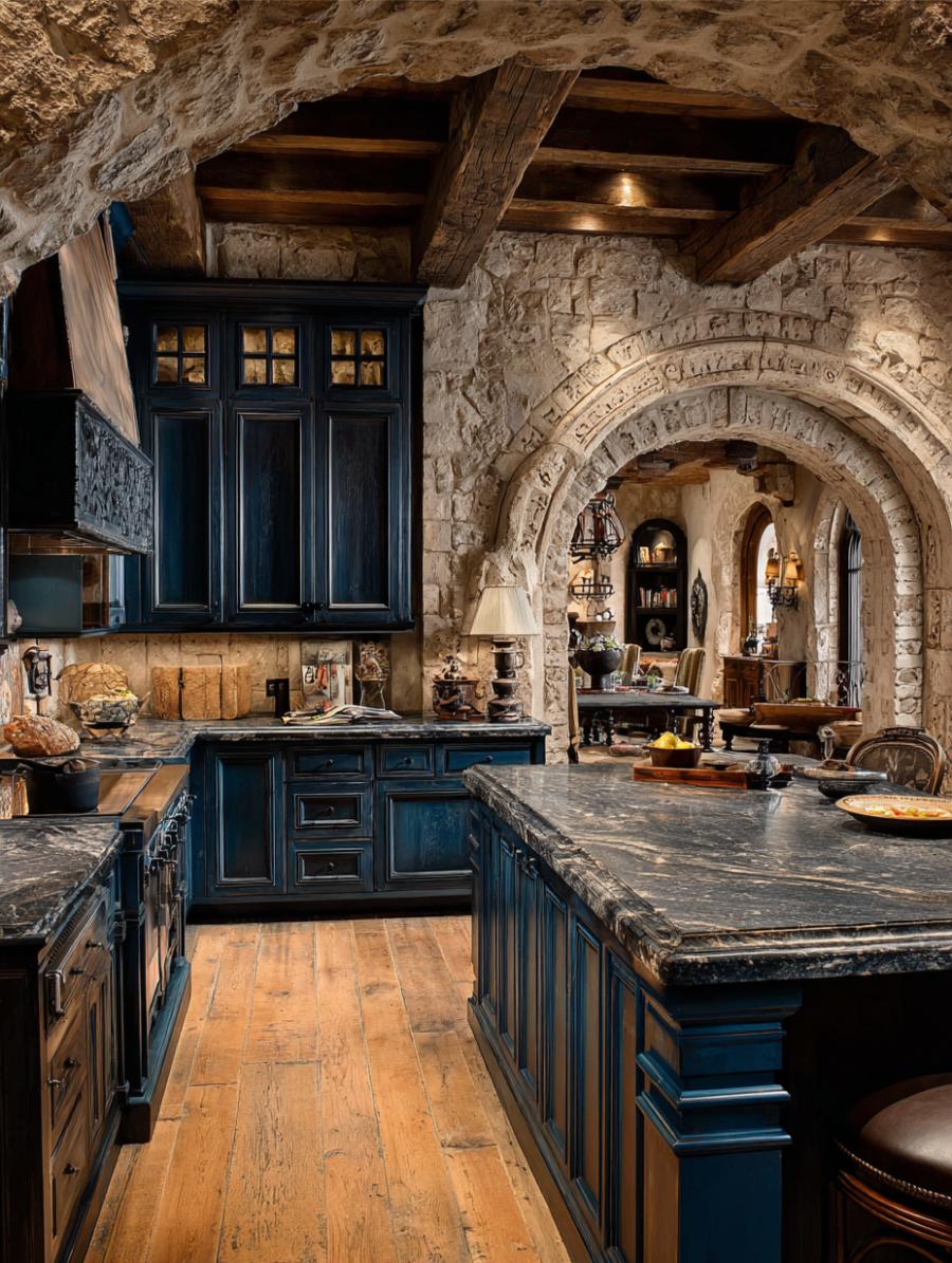 This stunning kitchen seamlessly blends deep navy blue cabinetry with rustic limestone walls and dramatic arched doorways, creating a space that feels like a luxurious European villa. Exposed wooden ceiling beams and wide-plank hardwood floors add warmth to the cool navy tones, while the dark granite countertops provide elegant contrast against the richly textured stone backsplash. The ornate carved archway leading to adjacent rooms enhances the old-world charm, making this kitchen a perfect example of how navy blue can anchor even the most elaborate traditional design.