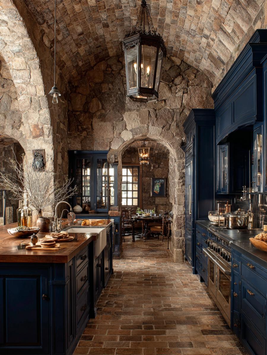 This breathtaking kitchen seamlessly blends rich navy blue cabinetry with ancient stone architecture, creating a space that feels both timeless and dramatically sophisticated. The deep blue painted cabinets provide a stunning contrast against the honey-toned stone walls and brick barrel-vaulted ceiling, while warm brass hardware and traditional lantern lighting add golden accents that enhance the room’s old-world charm. Rustic brick flooring and copper accessories complete this masterful fusion of historical architecture with contemporary navy kitchen design.