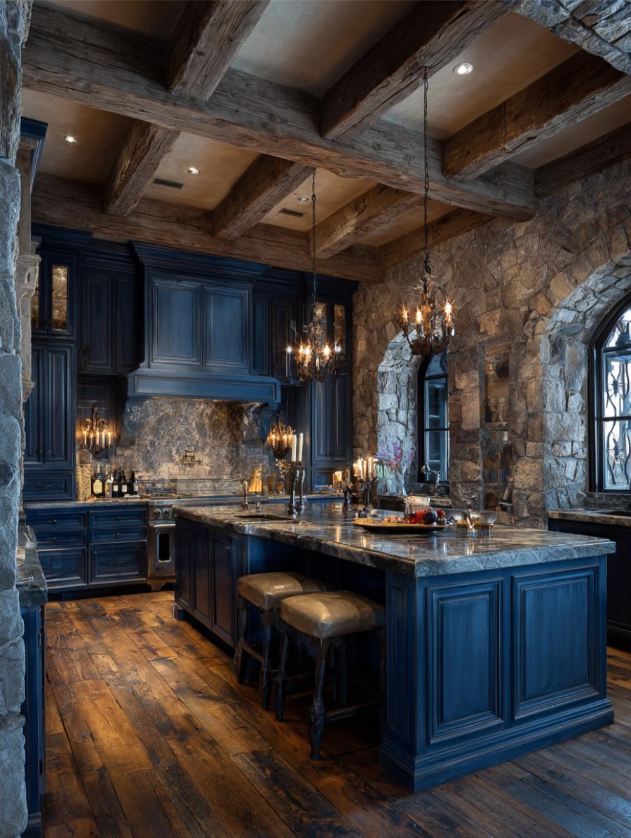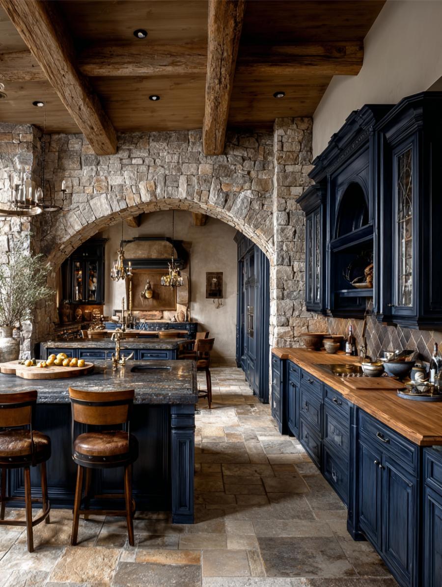 This stunning rustic kitchen seamlessly blends rich navy blue cabinetry with weathered stone archways and exposed wooden ceiling beams, creating a dramatic yet inviting medieval-inspired atmosphere. The deep blue painted cabinets are beautifully contrasted by warm butcher block countertops and leather bar stools, while the natural stone walls and flooring add authentic Old World character. Wrought iron chandeliers and carefully curated vintage accessories complete this luxurious space that feels both timeless and thoroughly modern.