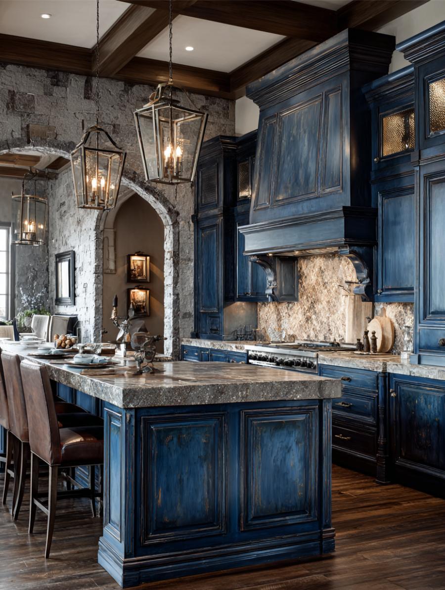 This breathtaking kitchen masterfully blends deep navy blue distressed cabinetry with rustic stone archways and warm wood beam ceilings, creating an atmosphere that feels both regal and invitingly lived-in. The rich blue finish on the custom millwork provides a stunning contrast against the weathered brick walls and granite countertops, while ornate lantern-style pendant lights cast a golden glow over the space. Every detail, from the textured stone backsplash to the carefully curated serving pieces displayed on open shelving, speaks to a design philosophy that celebrates both luxury and authentic, old-world craftsmanship.