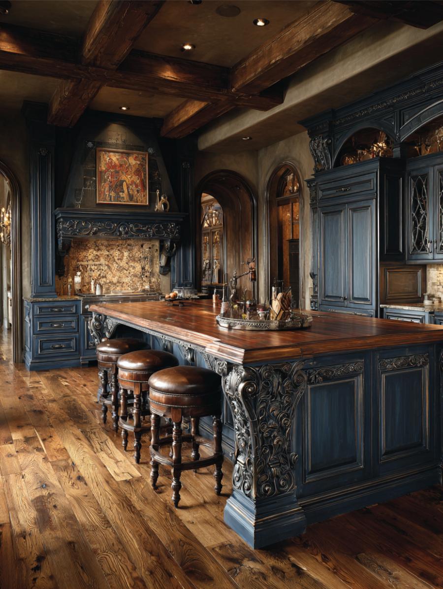 This breathtaking kitchen transports you to a European castle with its rich navy blue cabinetry adorned with elaborate carved corbels and ornate detailing throughout. The dramatic design pairs the deep blue woodwork with warm walnut countertops and rustic wide-plank floors, while exposed wooden ceiling beams and arched doorways complete the old-world aesthetic. Leather-topped bar stools and carefully curated vintage accessories add authentic medieval charm to this luxurious culinary masterpiece.