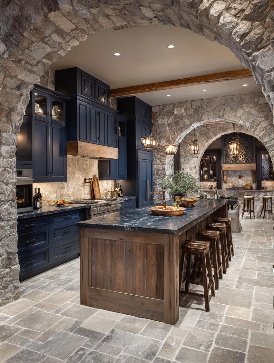 This stunning kitchen seamlessly blends rich navy blue cabinetry with warm reclaimed wood and ancient stone archways, creating a sophisticated rustic retreat that feels both timeless and luxurious. The dramatic black marble island anchors the space while pendant lighting casts a warm glow over natural stone walls and travertine floors. The design masterfully balances Old World charm with modern functionality, featuring a wine cellar visible through an arched stone opening that adds to the Mediterranean villa aesthetic.