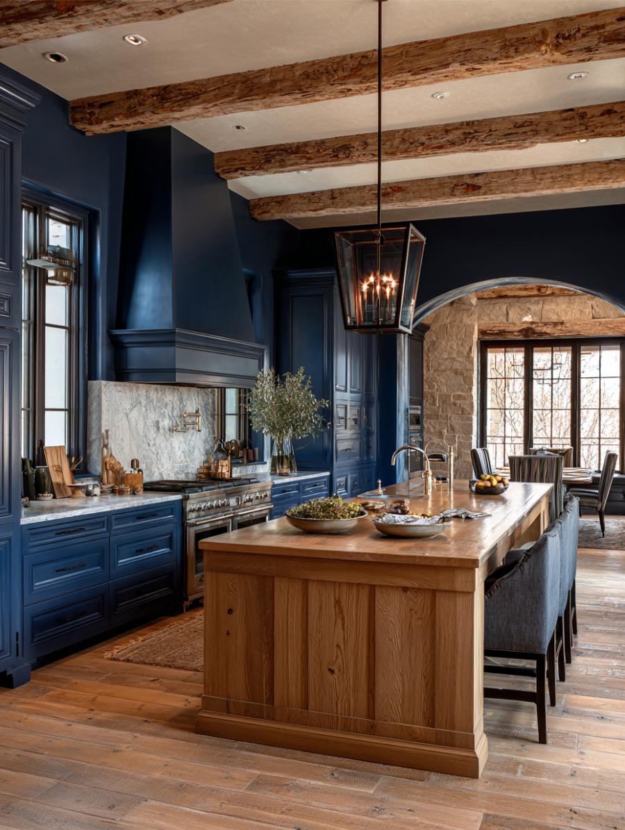 This stunning kitchen masterfully balances rich navy blue cabinetry with warm natural elements, featuring exposed wooden ceiling beams and a gorgeous oak island that anchors the space. The marble backsplash and sleek pendant lighting add sophisticated touches, while the stone archway and weathered wood floors maintain the rustic charm. The deep blue walls create a bold, cocooning atmosphere that feels both dramatic and inviting, proving that navy kitchens can be both striking and wonderfully livable.
