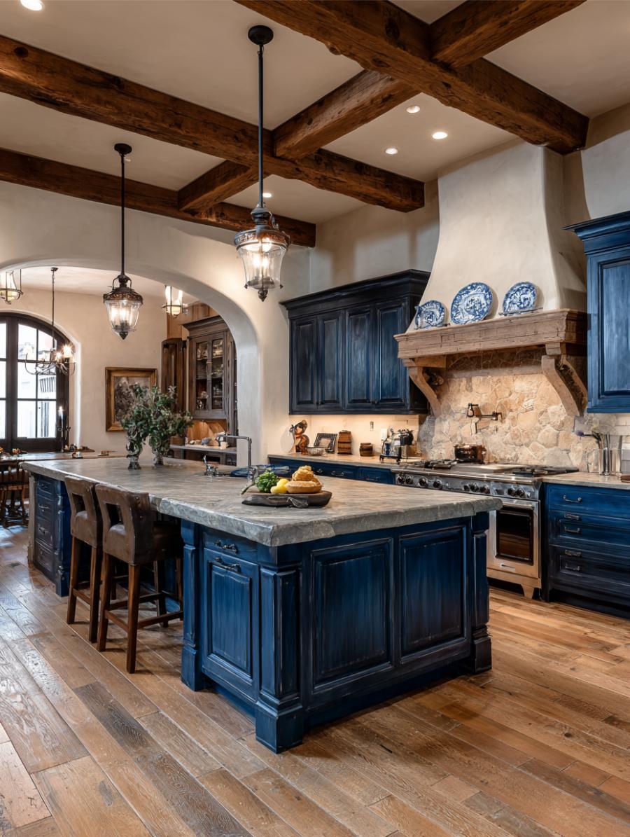 This stunning kitchen seamlessly blends rich navy blue cabinetry with rustic Mediterranean elements, featuring exposed wooden ceiling beams, natural stone archways, and warm hardwood floors. The deep blue island and matching upper cabinets create a sophisticated contrast against the textured stone walls and creamy backsplash, while brass pendant lights and traditional lantern-style fixtures add warmth and vintage charm. The space exudes old-world luxury with its arched doorways leading to an adjacent dining area, perfectly balancing bold color choices with timeless architectural details.