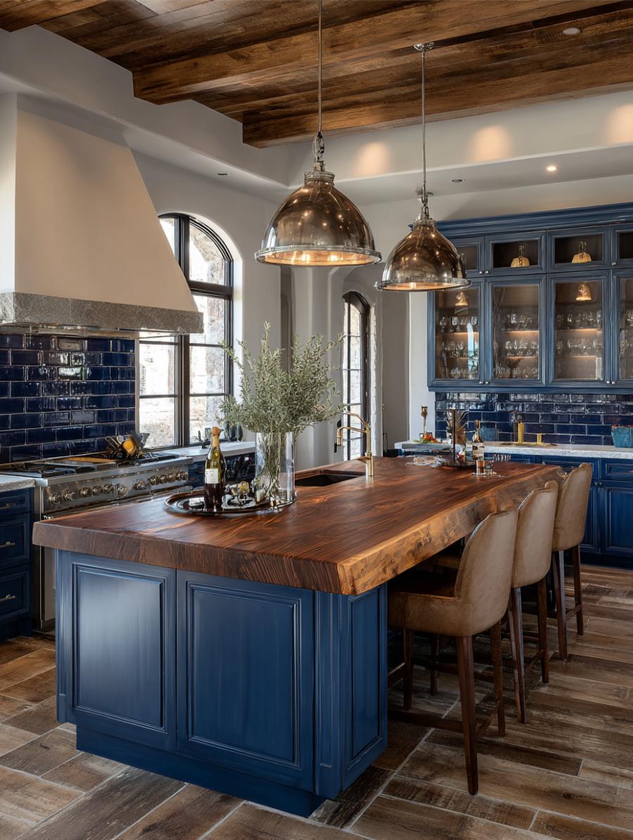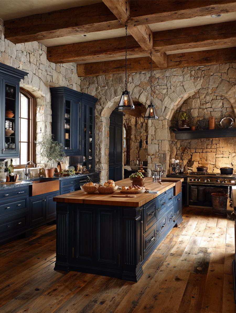 This stunning kitchen masterfully blends deep navy blue cabinetry with natural stone walls and exposed wooden beams, creating a perfect marriage of rustic charm and refined elegance. The rich indigo cabinets provide a sophisticated contrast against the warm honey-toned stone archway and reclaimed wood floors, while pendant lighting and copper accents add warmth to the space. The kitchen island’s butcher block countertop and decorative woven baskets enhance the organic, farmhouse-inspired aesthetic that feels both timeless and luxuriously appointed.