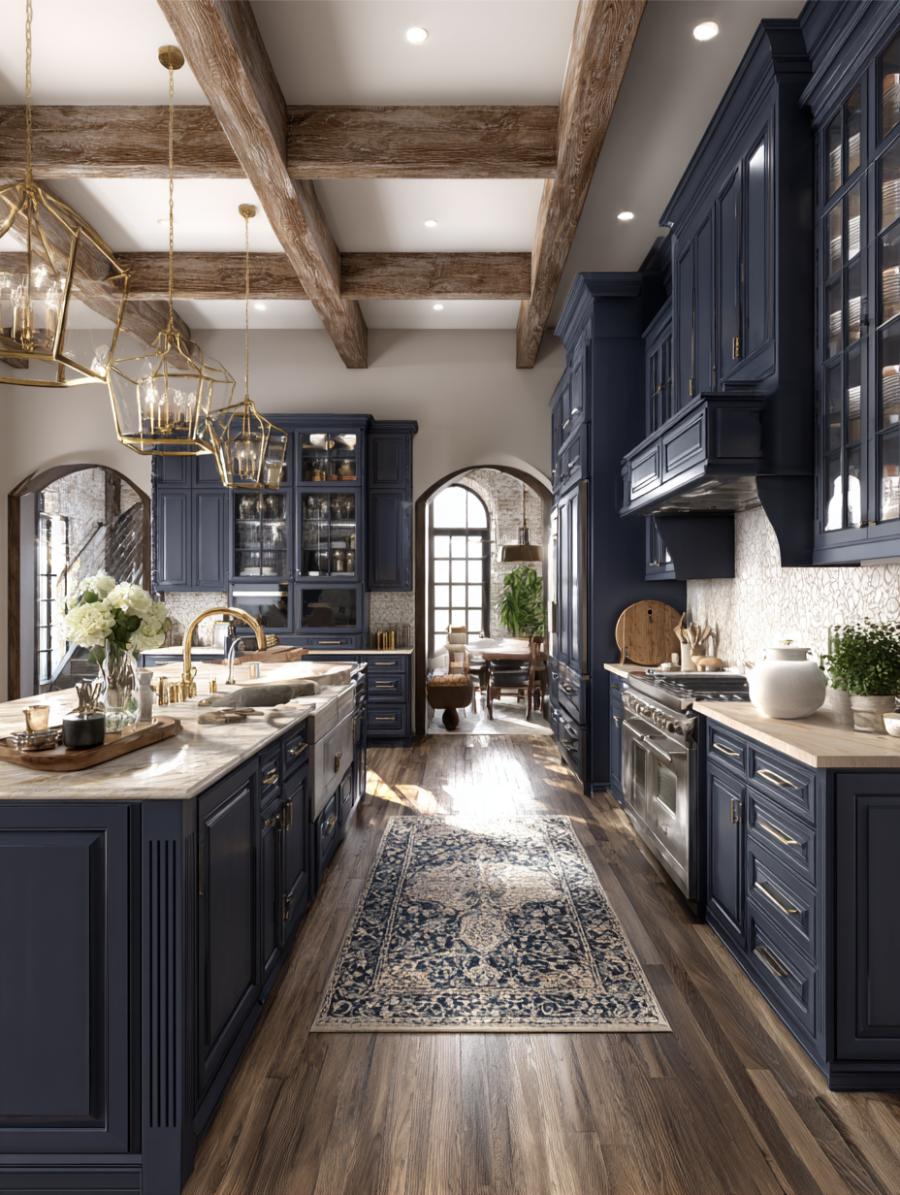 This sophisticated kitchen masterfully combines deep navy blue cabinetry with rustic exposed wooden ceiling beams and gleaming brass fixtures for a look that’s both timeless and luxurious. The rich marble countertops and traditional Persian-style runner add layers of texture and warmth, while the geometric brass pendant lights create dramatic focal points above the expansive island. Arched doorways and glass-front cabinets enhance the European-inspired aesthetic, making this space feel like a refined countryside estate with a distinctly nautical twist.