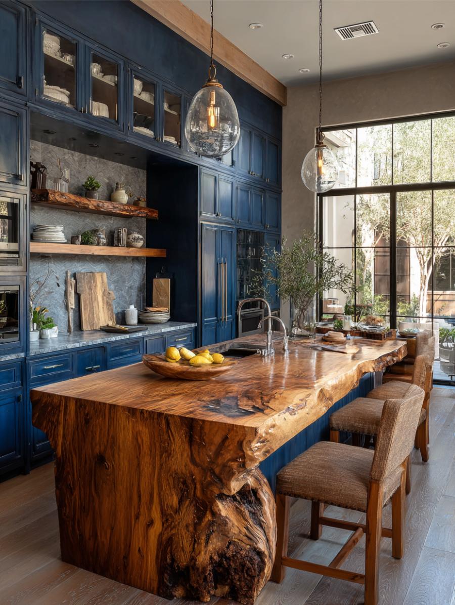This stunning kitchen showcases rich navy blue cabinetry paired with an extraordinary live-edge wood island that serves as both workspace and sculptural centerpiece. The dramatic contrast between the polished blue cabinets and the raw, natural wood creates a sophisticated yet organic atmosphere, while woven bar stools and warm pendant lighting add layers of texture and warmth. Floor-to-ceiling windows flood the space with natural light, highlighting the beautiful grain patterns in the wood and creating a seamless connection between the refined interior and the outdoor landscape.
