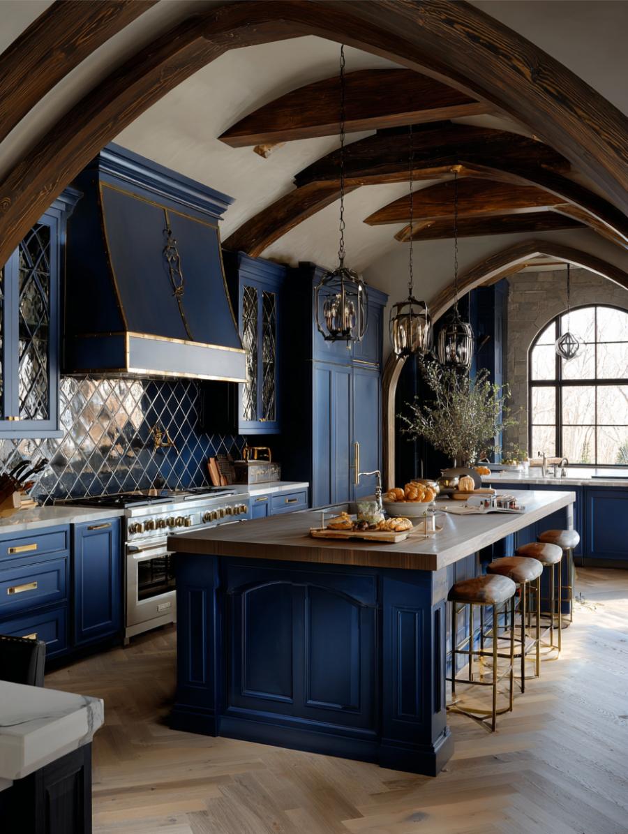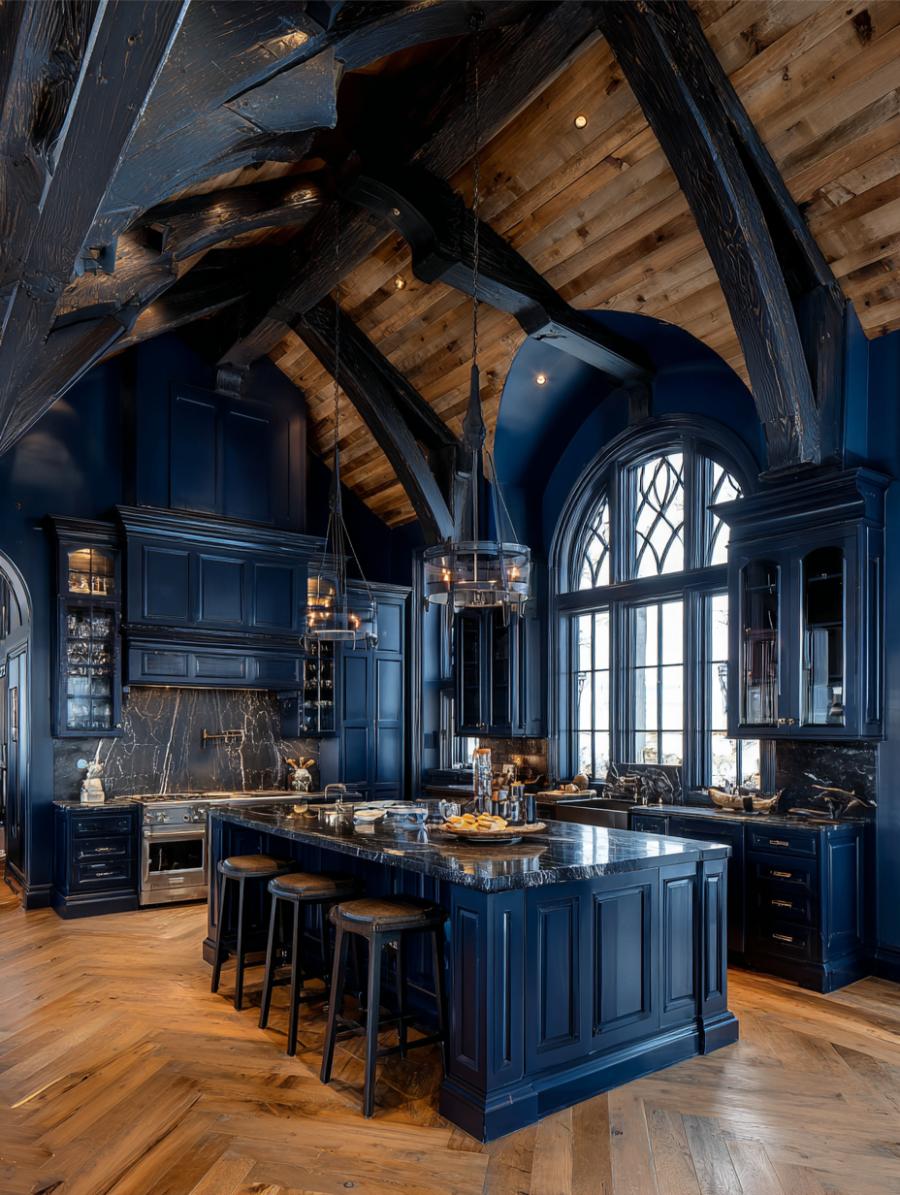 This breathtaking kitchen transforms the classic navy palette into something truly extraordinary with its cathedral-style vaulted ceilings, dramatic exposed dark timber beams, and rich natural wood planking overhead. The deep navy blue cabinetry creates a striking contrast against the warm honey-toned hardwood floors, while the Gothic arched windows and ornate architectural details give this culinary space the grandeur of a medieval castle. Industrial-style pendant lighting and dark marble countertops complete the moody, luxurious atmosphere that perfectly balances old-world charm with contemporary kitchen functionality.