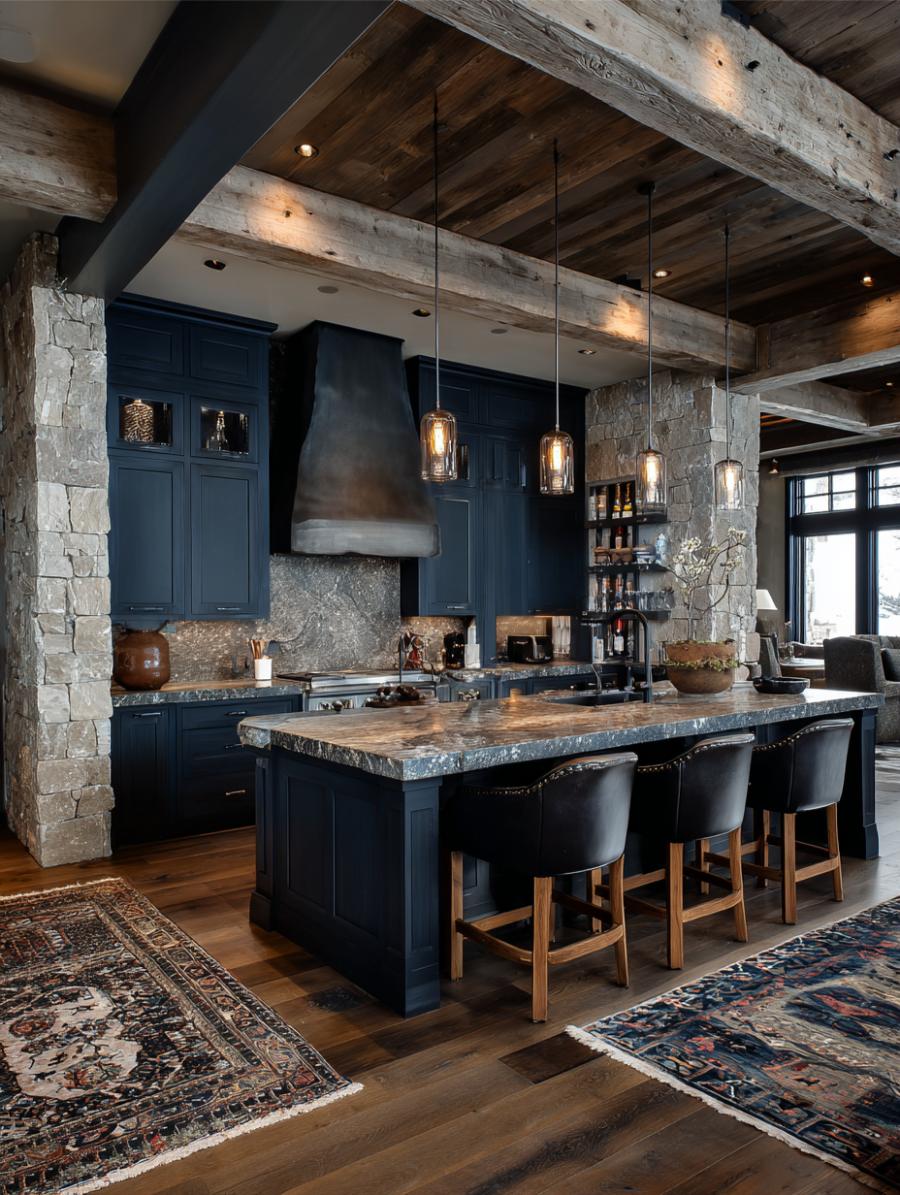 This stunning kitchen masterfully blends deep navy cabinetry with raw natural elements, featuring weathered wood beam ceilings and stone columns that create an authentic mountain retreat atmosphere. The dramatic granite countertops with live-edge wood accents complement the rich navy blue shaker-style cabinets, while pendant lights with amber glass shades cast a warm glow over the spacious island seating area. Traditional Persian rugs in earthy tones ground the space, adding layers of texture that perfectly balance the kitchen’s sophisticated rustic charm.