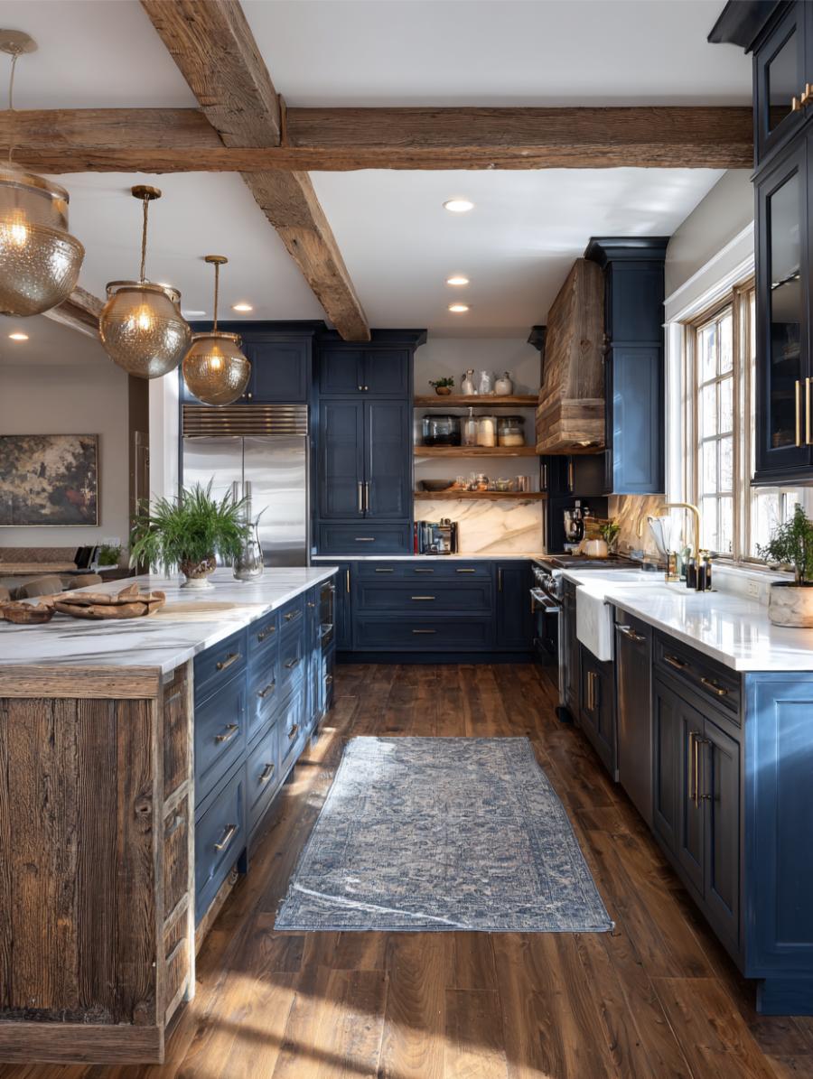 This breathtaking kitchen seamlessly blends rich navy blue cabinetry with warm rustic elements, featuring exposed wooden ceiling beams and a striking walnut island topped with luxurious marble countertops. The deep blue cabinets are beautifully complemented by brass hardware and floating wood shelves, while pendant lights with glass globes add a sophisticated touch above the island. Wide-plank hardwood floors and a farmhouse sink complete the look, creating a perfect balance of modern elegance and cozy country charm.