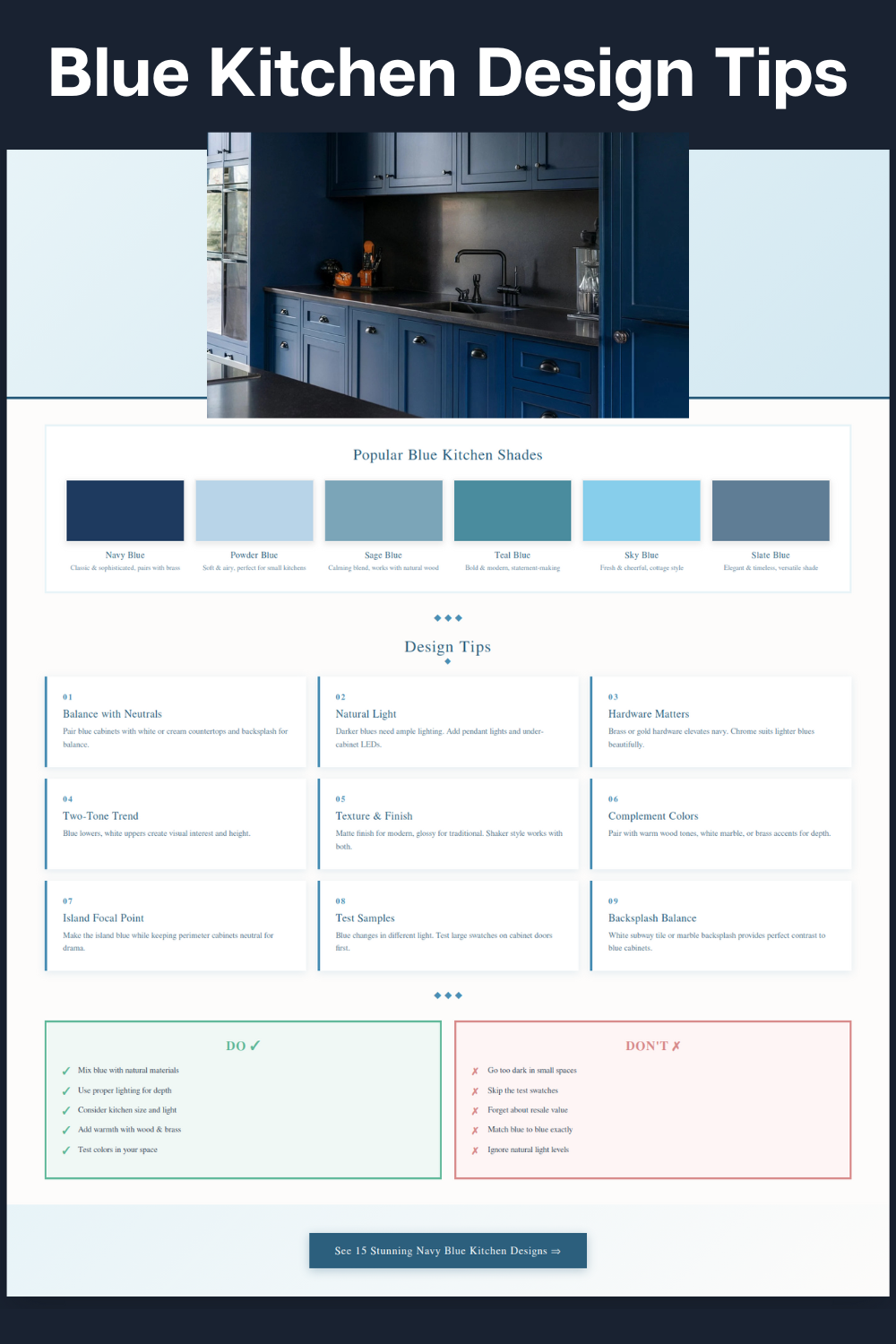 I particularly appreciate how navy blue adds richness that doesnโt feel overwhelming, even in compact kitchens. It allows for easy adaptation with various decor styles, offering longevity and versatility for homeowners who might want to update the look over time.