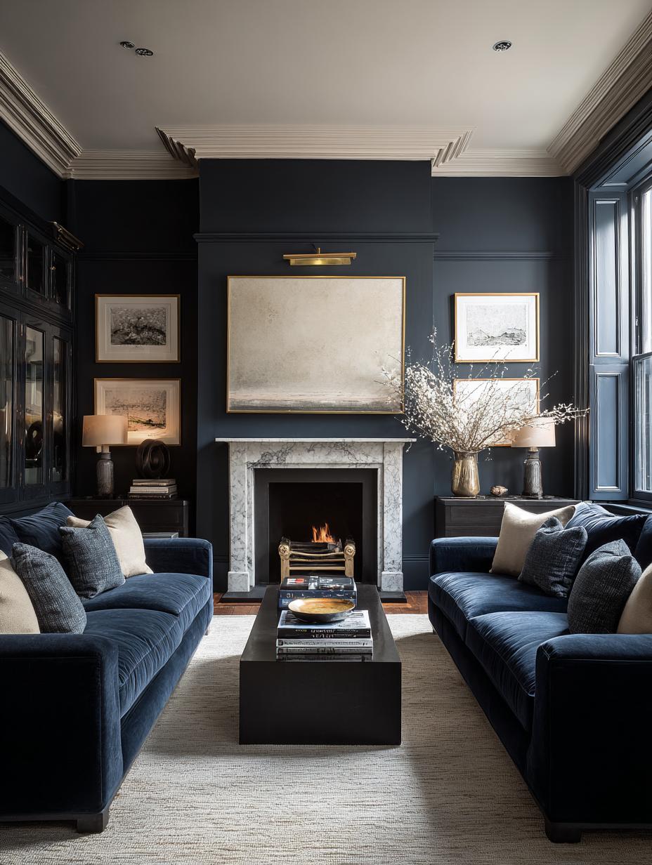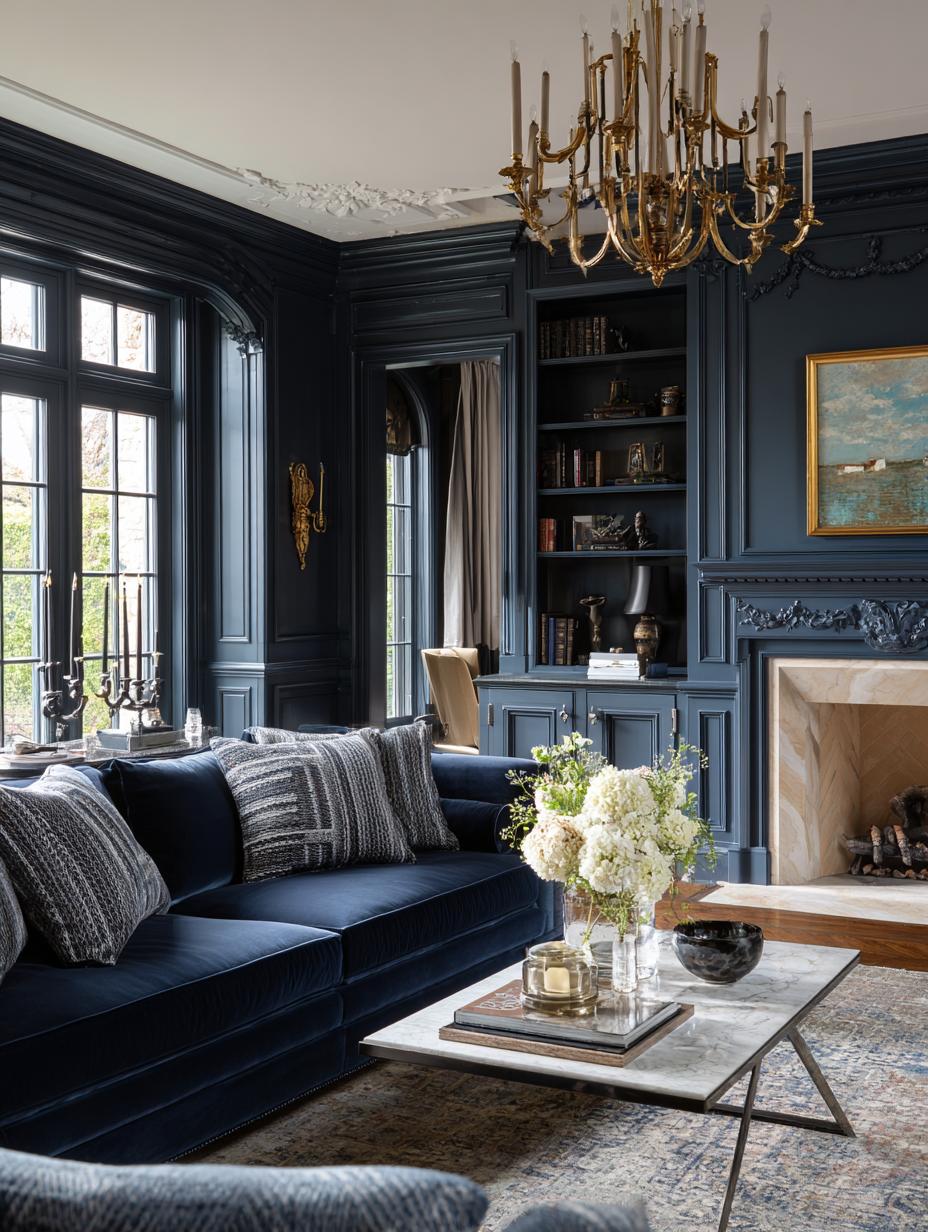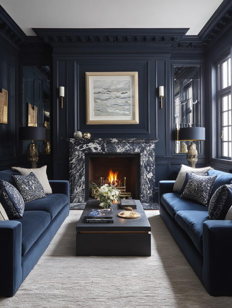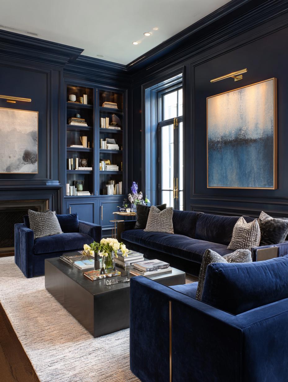 Rich navy blue paneling envelops this refined living room, creating an intimate sanctuary that exudes old-world elegance. Two plush navy velvet sofas frame a sleek dark wood coffee table, while the marble fireplace anchors the space with classical sophistication. Brass picture lights illuminate carefully curated artwork, and the coffered ceiling adds architectural drama that elevates the entire roomโs luxurious aesthetic.