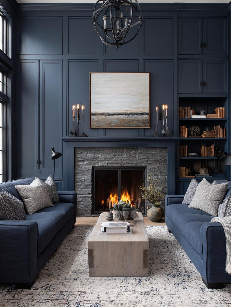 Rich navy blue millwork transforms this living room into a gentlemanโs library, complete with floor-to-ceiling built-in shelving and cabinet storage. Two matching sofas upholstered in complementary blue tones frame a stone-clad fireplace, while warm Edison bulb sconces and a sculptural orb chandelier add ambient lighting. The neutral wood coffee table and vintage area rug soften the monochromatic palette, creating perfect balance between formal elegance and everyday comfort.