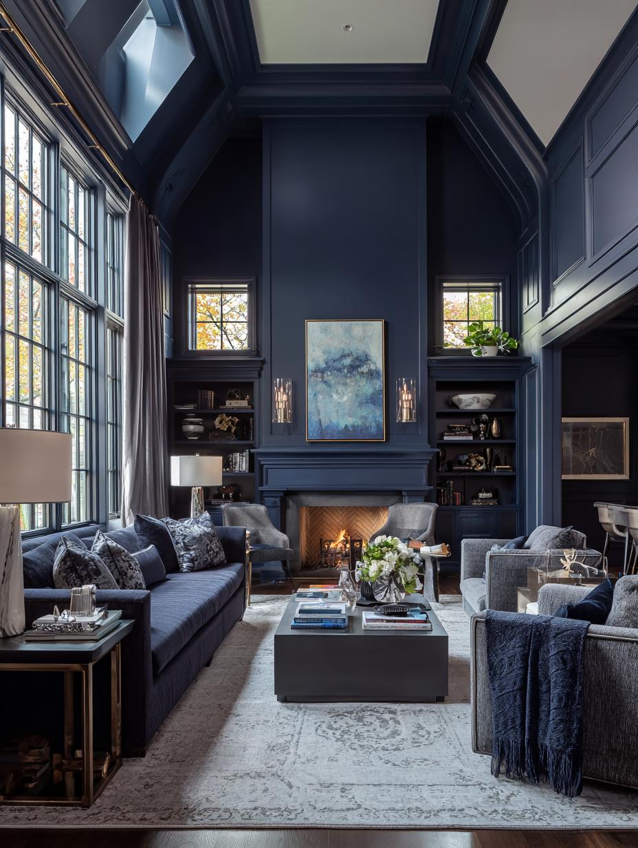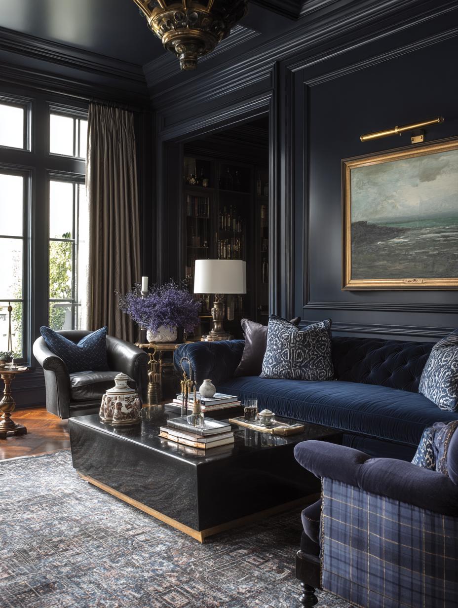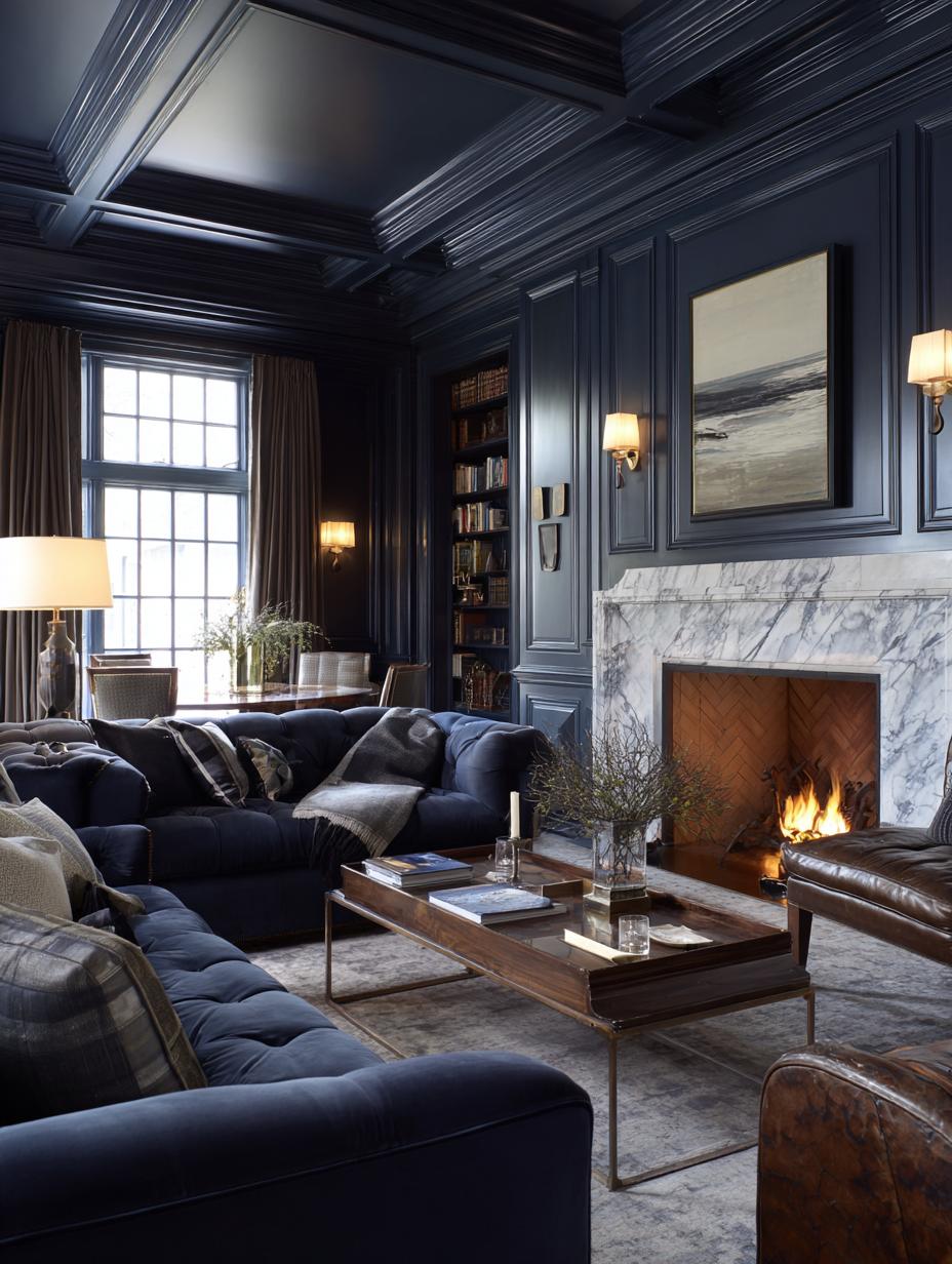 Deep navy paneling creates architectural drama throughout this luxurious living room, where coffered ceilings add dimensional richness above plush sectional seating. Warm brass sconces provide intimate lighting against the moody walls, while a marble fireplace anchors the space with classical elegance. Rich leather accents and carefully curated books enhance the scholarly atmosphere.