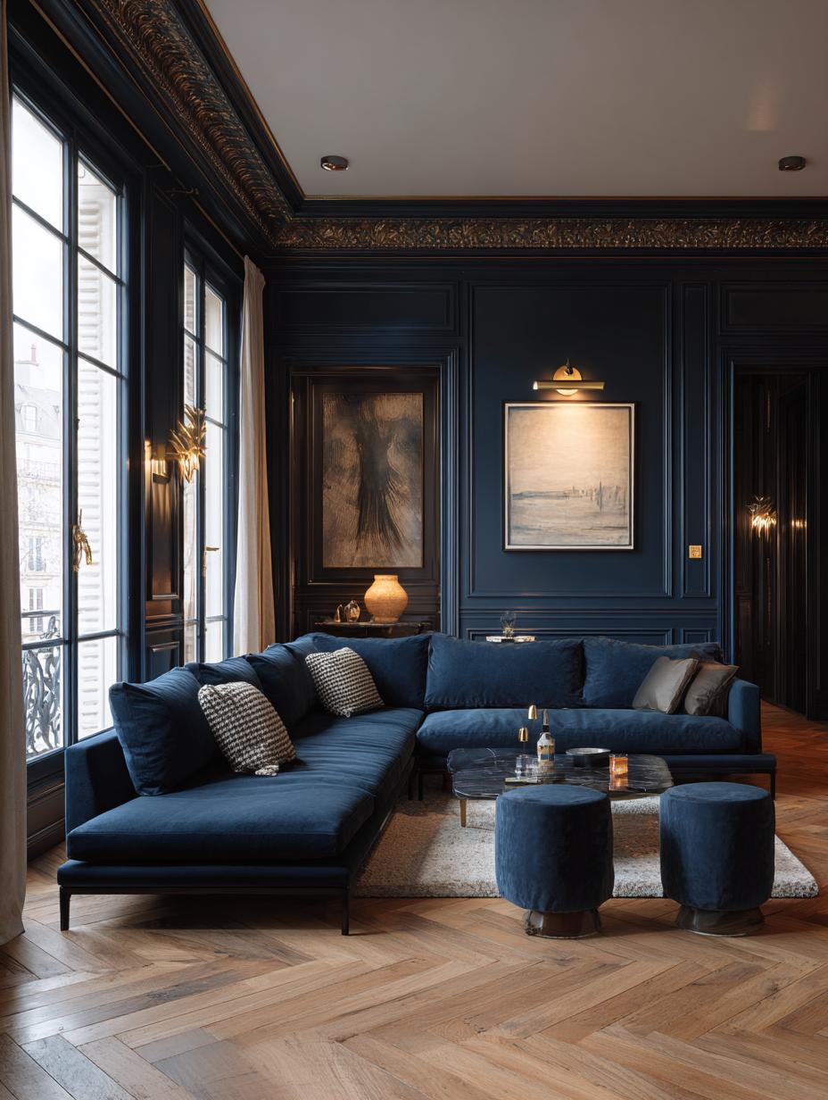 Ornate gilded molding crowns deep navy paneled walls, establishing an undeniably luxurious foundation for this sophisticated seating area. Rich velvet upholstery echoes the wall color while herringbone hardwood floors add warmth and texture. Brass picture lighting illuminates carefully curated artwork, while geometric throw pillows provide subtle pattern contrast. Large windows flood the space with natural light, preventing the dark palette from feeling heavy or oppressive.