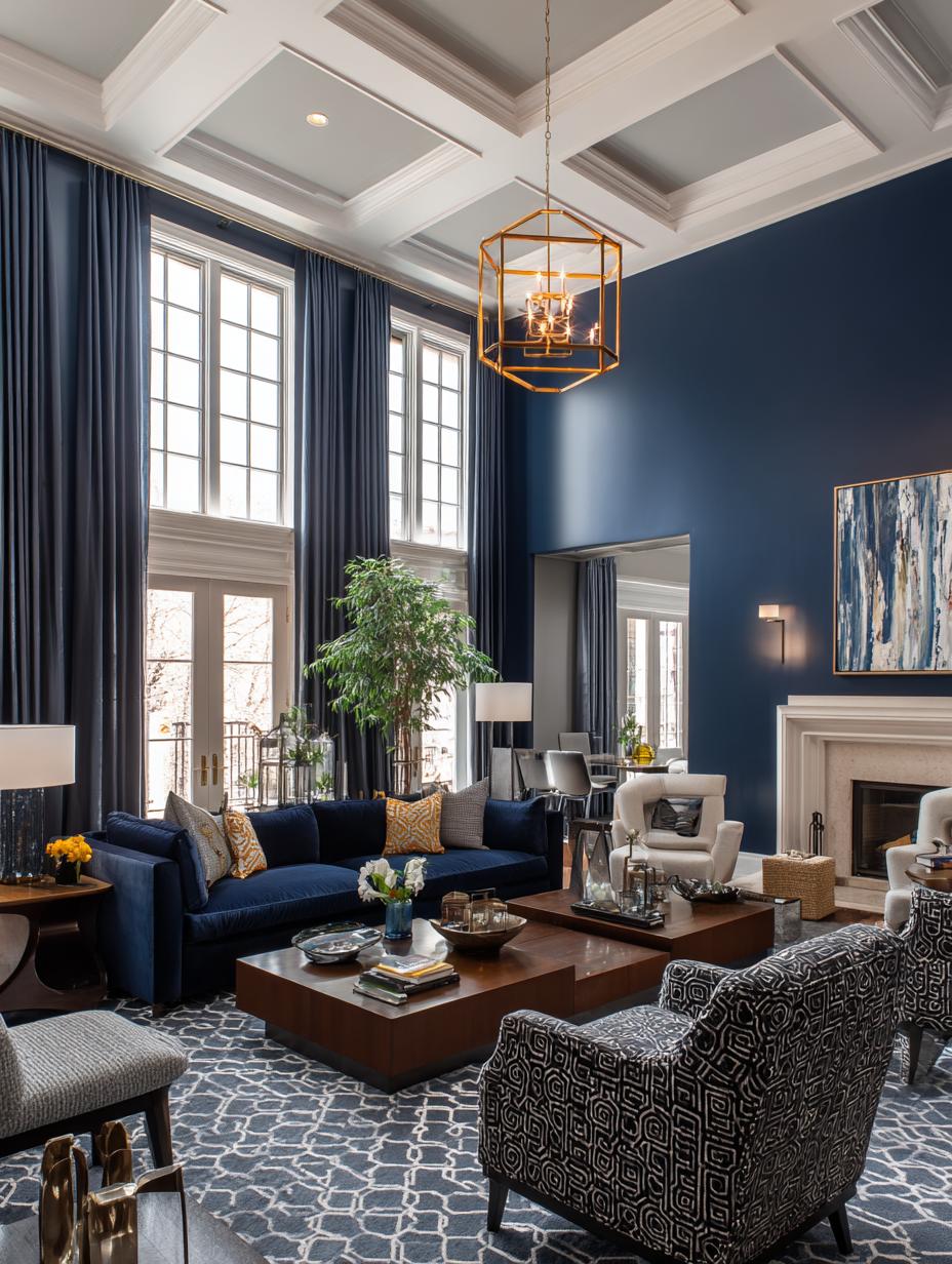Navy velvet sectional seating anchors this soaring living room while dramatic coffered ceilings add architectural gravitas overhead. Brass geometric pendant lighting creates focal drama, complementing the rich walnut coffee table and geometric area rug. Floor-to-ceiling windows flood the space with natural light, perfectly balancing the bold navy walls with crisp white millwork and creating an atmosphere of refined elegance.
