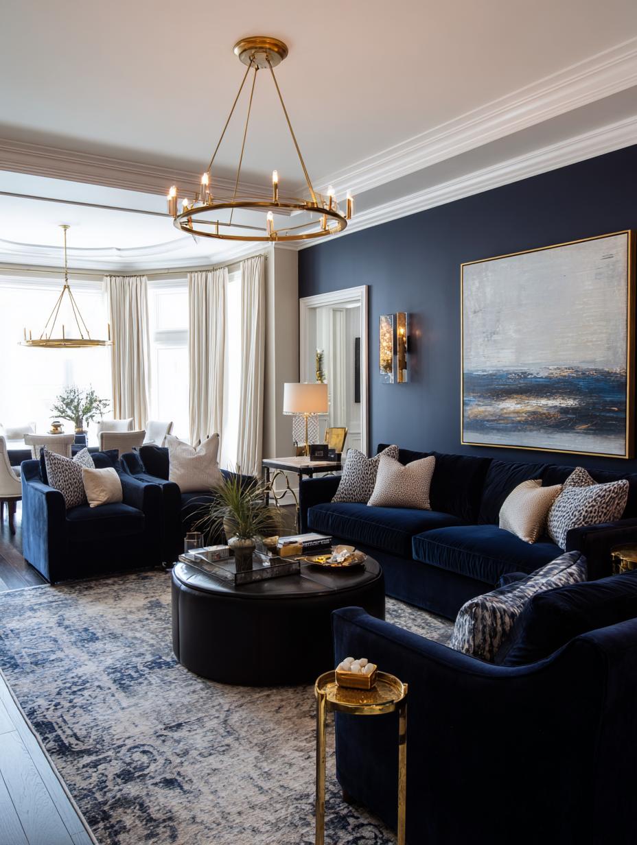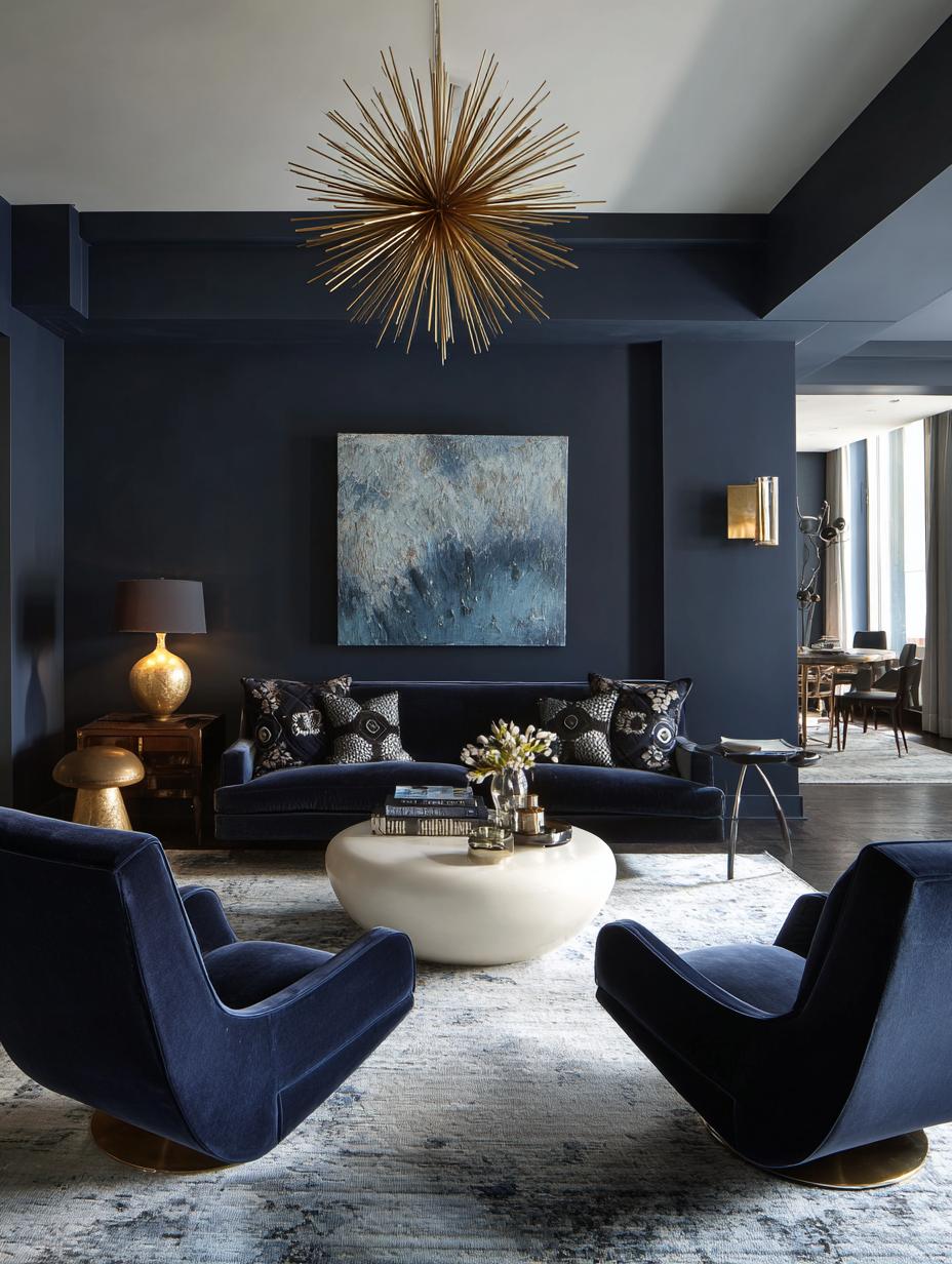 Bold navy walls create an intimate cocoon around plush velvet seating and a striking gold sunburst chandelier that radiates dramatic elegance. The cream oval coffee table anchors the conversation area while brass accents throughout the space add warmth against the deep blue palette. Curved swivel chairs maximize flexibility for entertaining, while abstract artwork echoes the roomโs sophisticated blue-gray color story.