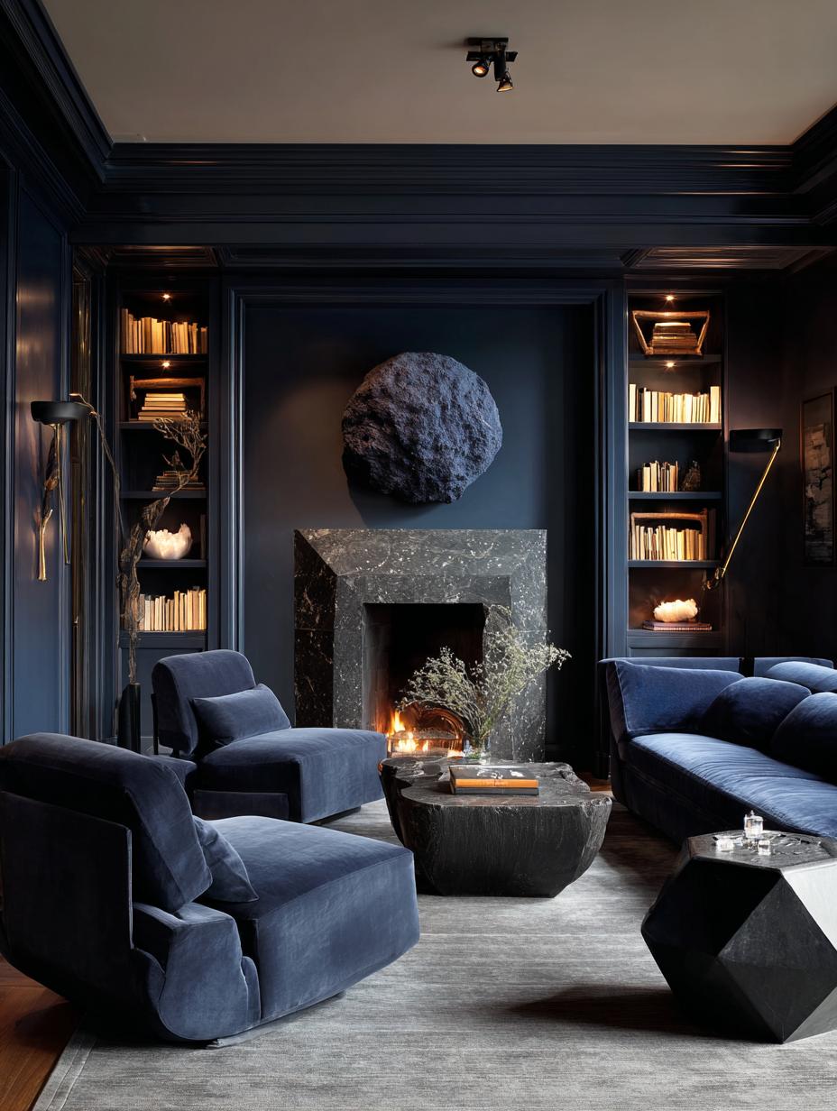 Deep navy millwork envelops this sophisticated living room, transforming it into a cozy literary sanctuary. Plush velvet seating in matching navy tones creates seamless visual flow, while the dramatic stone fireplace anchors the space with raw texture. Built-in shelving displays curated books and sculptural objects, enhanced by warm accent lighting that highlights the roomโs luxurious materials and creates perfect ambiance for evening relaxation.
