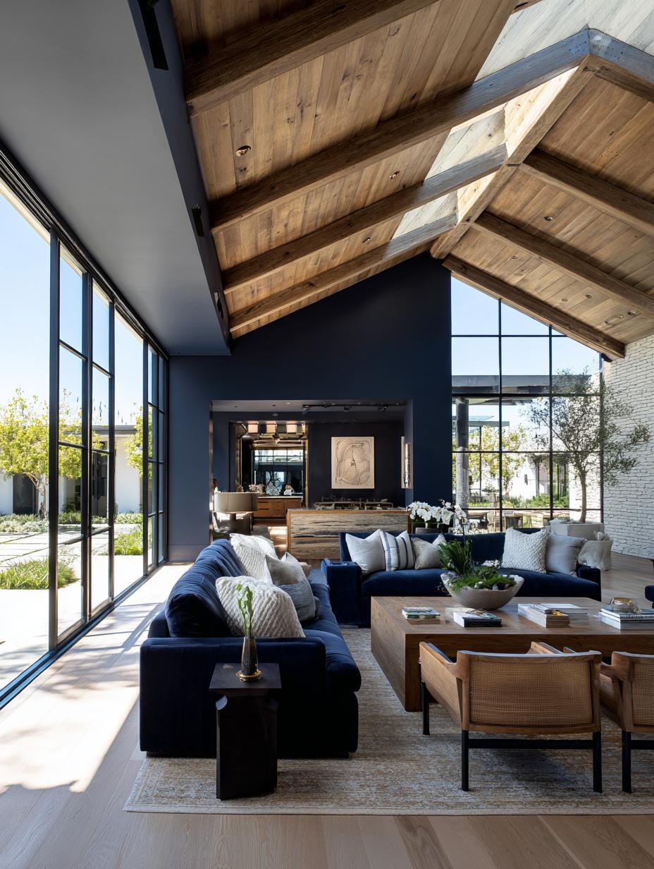 Exposed reclaimed wood beams create dramatic vertical interest while navy velvet sectional seating anchors this sophisticated living space. Floor-to-ceiling black steel windows flood the room with natural light, balancing the deep blue accent wall. Woven cane accent chairs and a live-edge wood coffee table introduce organic textures that soften the bold color palette and architectural elements.