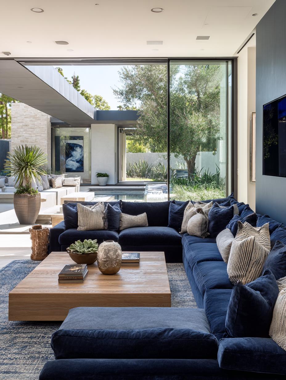 Luxurious navy blue velvet upholstery commands attention in this open-concept living space, where natural light pours through dramatic glass walls. Rich walnut coffee table grounds the seating arrangement while neutral striped and solid throw pillows create sophisticated layering. Seamless indoor-outdoor flow connects the plush interior seating to minimalist patio furniture, establishing perfect entertaining zones that blur boundaries between comfort and contemporary architecture.