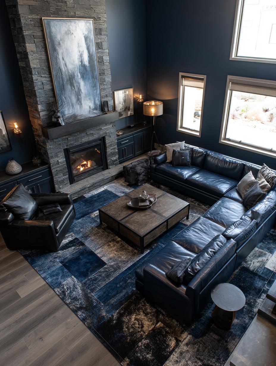 Deep navy walls create an intimate backdrop for this sophisticated sectional arrangement, where charcoal leather seating curves around a live-edge coffee table. Natural stone fireplace anchors the space with textural warmth, while abstract artwork and brass table lamps add refined finishing touches. Distressed area rugs in complementary blues ground the seating area, creating perfect balance between masculine materials and luxurious comfort for entertaining.