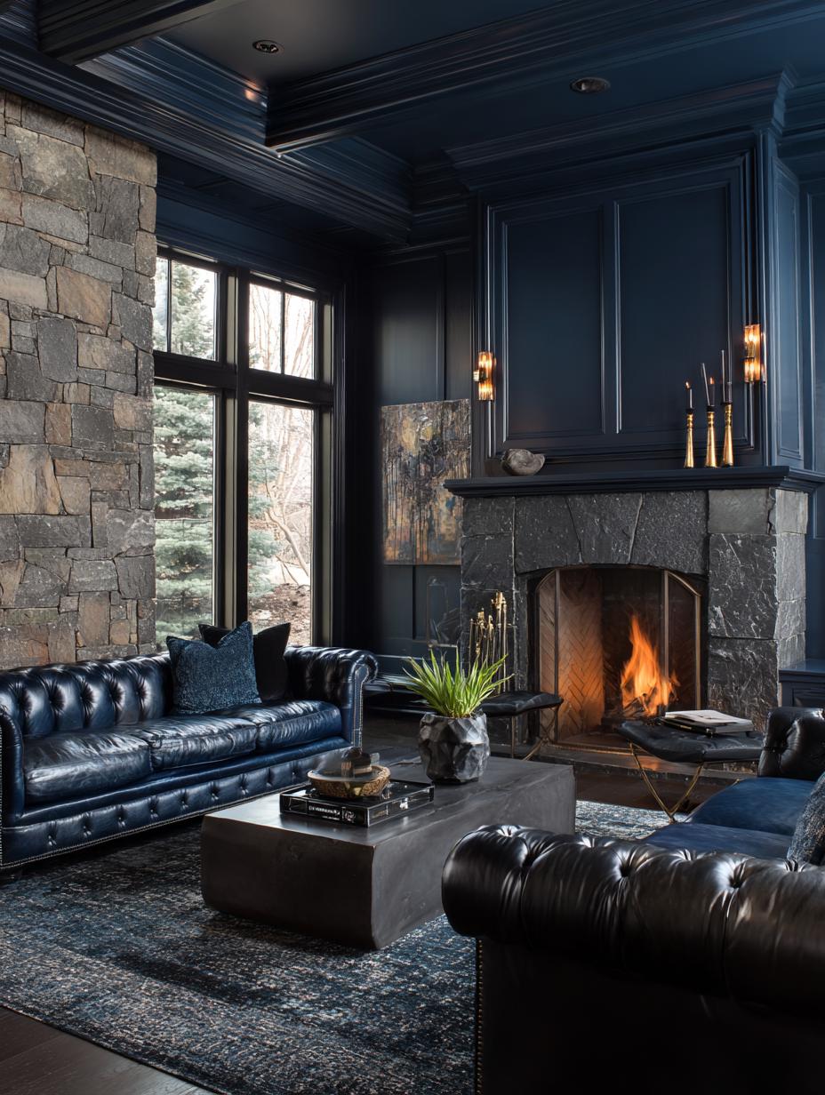 Deep navy millwork creates sophisticated architectural drama while charcoal stone fireplace surround anchors the masculine retreat. Tufted black leather seating pairs beautifully with brass candlesticks and warm amber lighting. Rich textures from the patterned area rug and natural stone wall add layers of luxury that elevate this moody, club-like atmosphere into pure elegance.